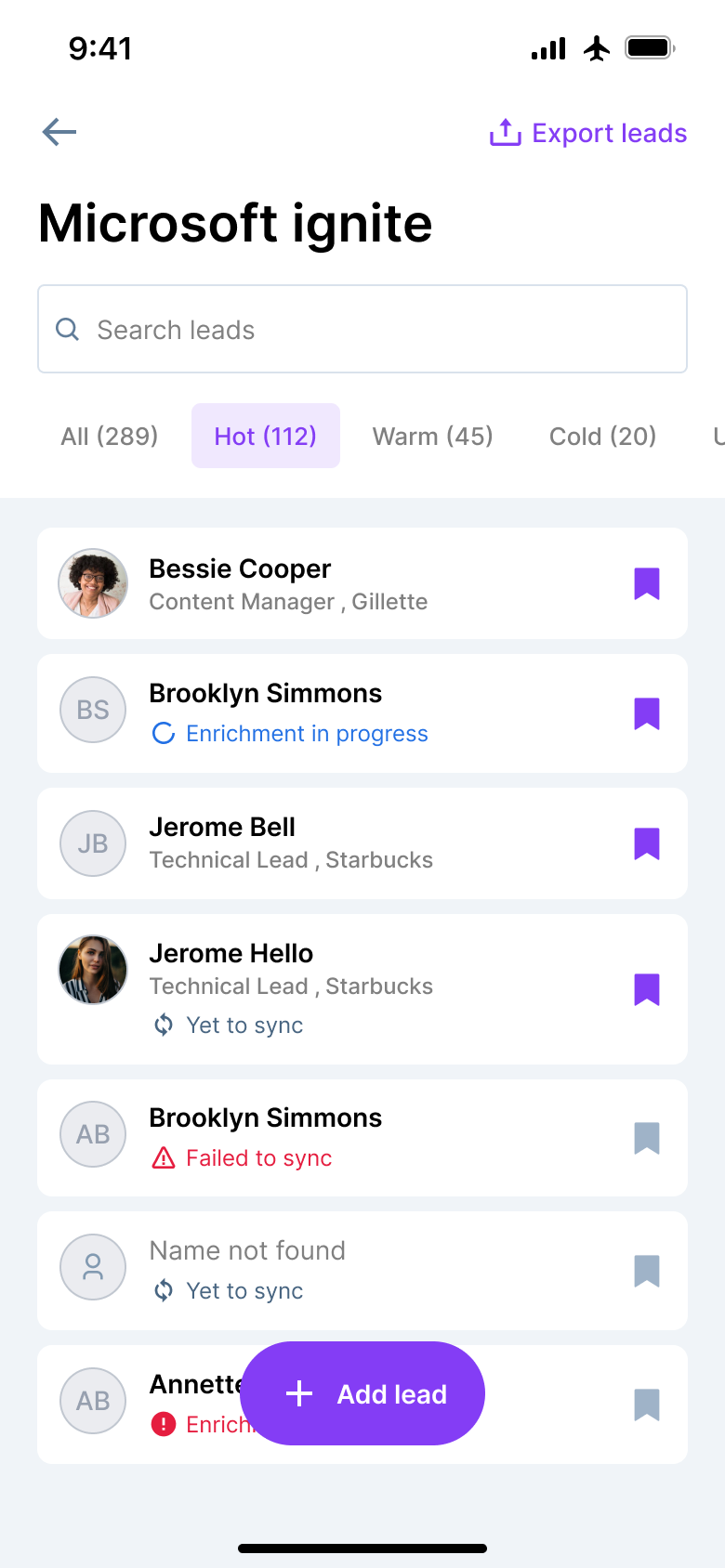 The leads with failed, in progress, and yet to sync are shown with a label but the enriched leads appear without any status.