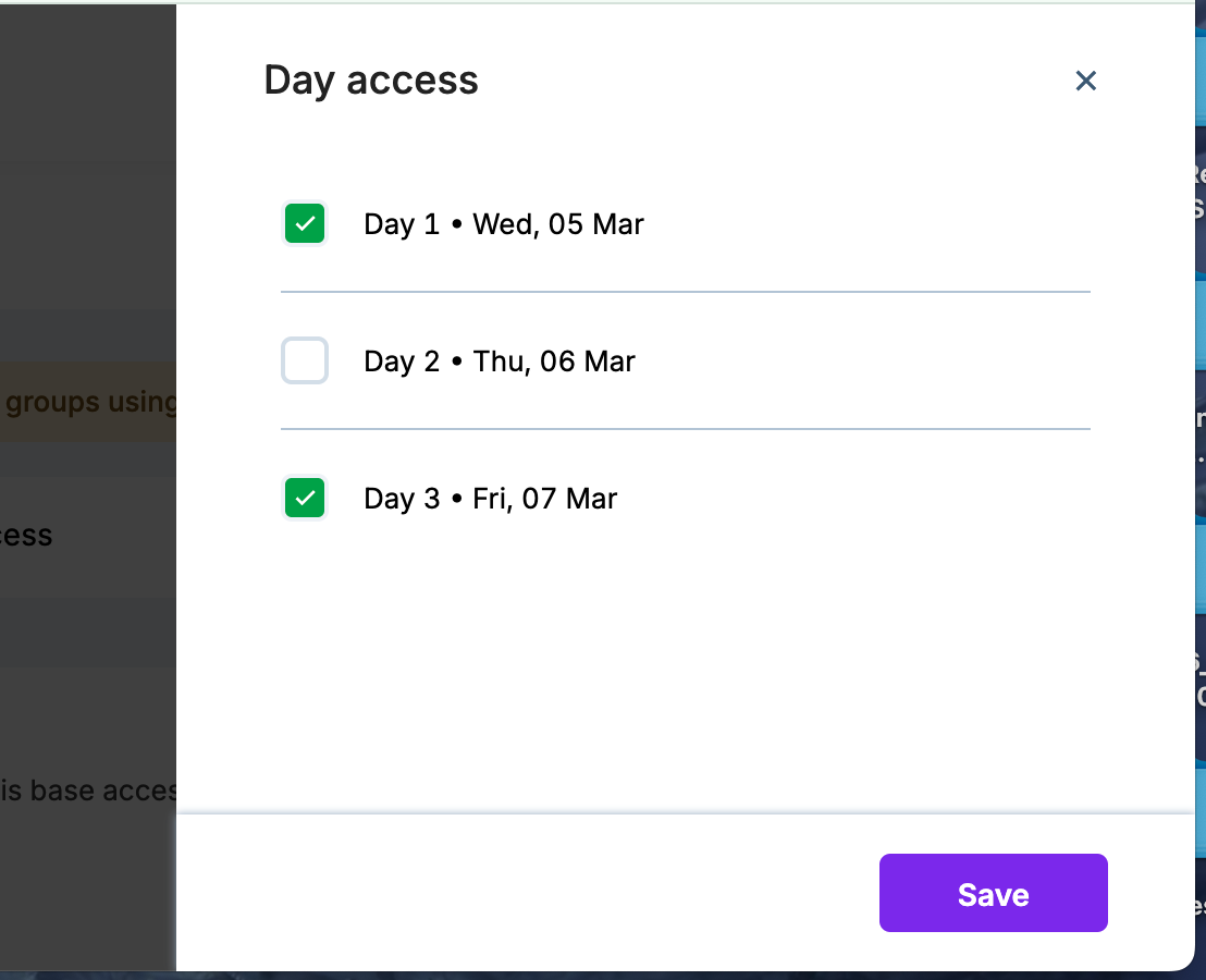 For a multi-day event, the accessible days will be listed in the section as shown below: