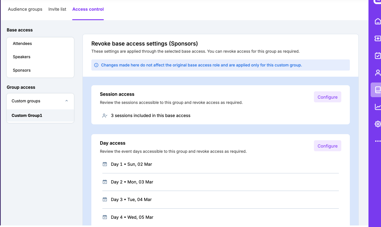 Base access: The pre-configured access settings for standard groups (i.e. Attendees, Speakers, and Sponsors) based on which access can be configured for the custom groups groups.