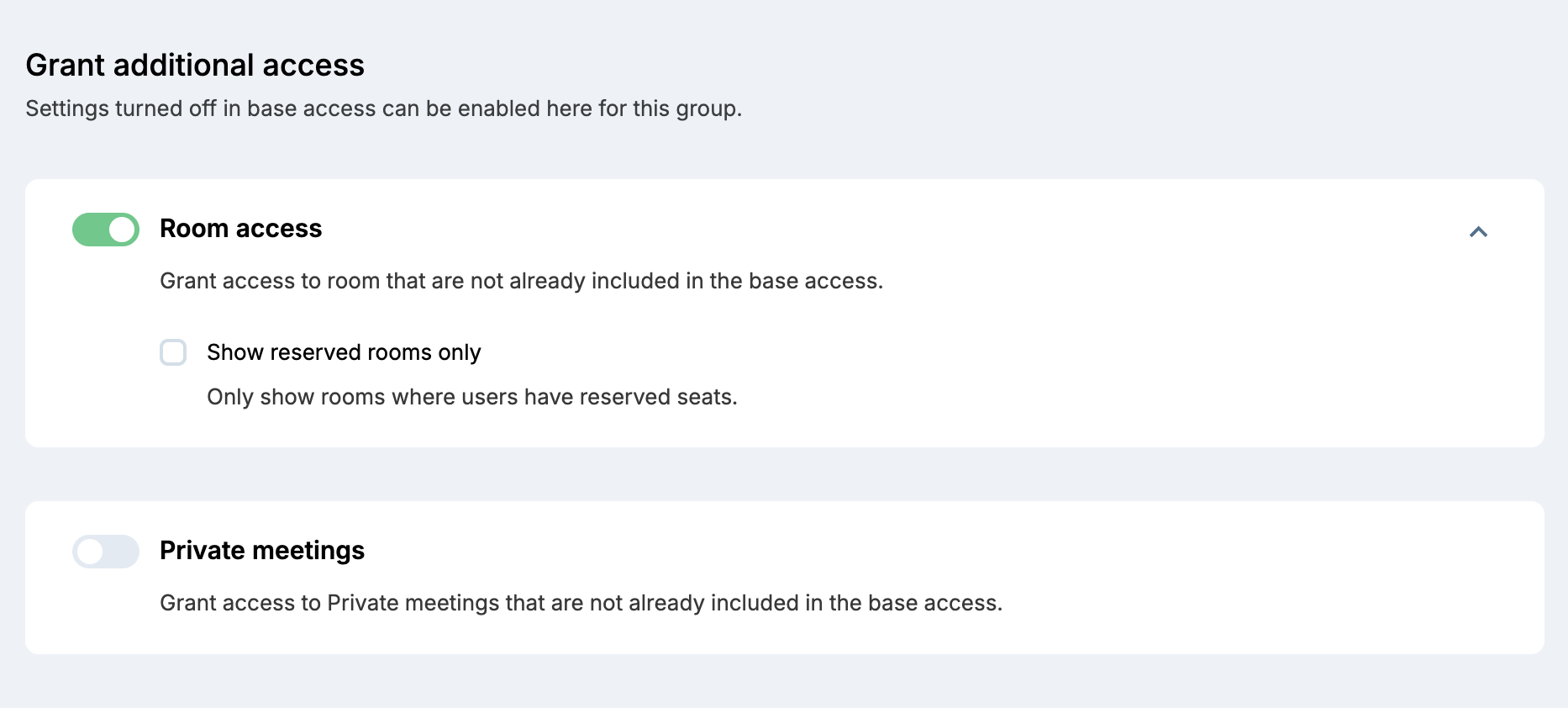 Sub-controls like the 'Show reserved rooms only' under Room access in the image above are also shown in the additional access setting.