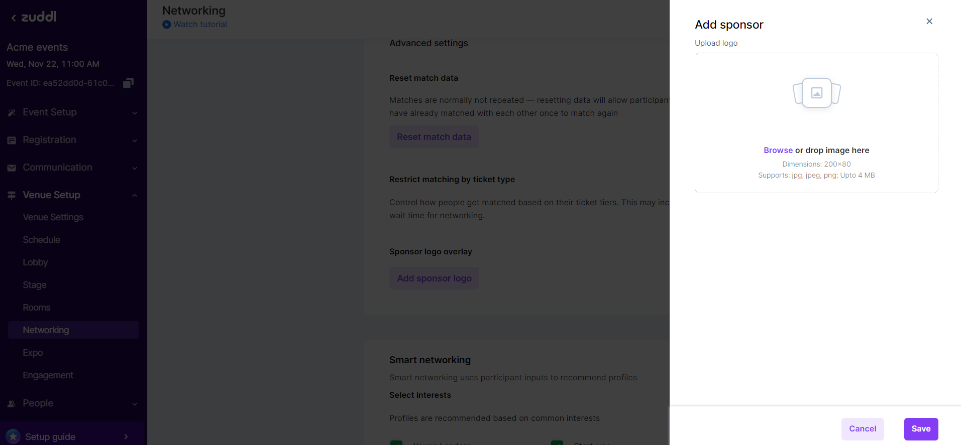 8. Click on the Add Sponsor logo button and a right-side pane opens to upload a JPG, JPEG, or PNG image which is 200x80 in dimensions up to 4 MB. This is visible to the attendees during the networking session.