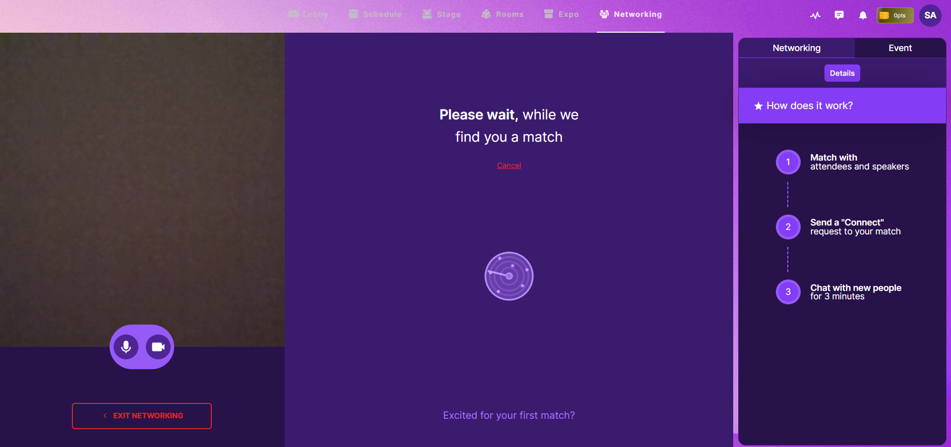 3. Inside Quick Networking, attendees are matched with others randomly and can talk to them for a fixed amount of time. To share contact information with the other person, they can click Connect.