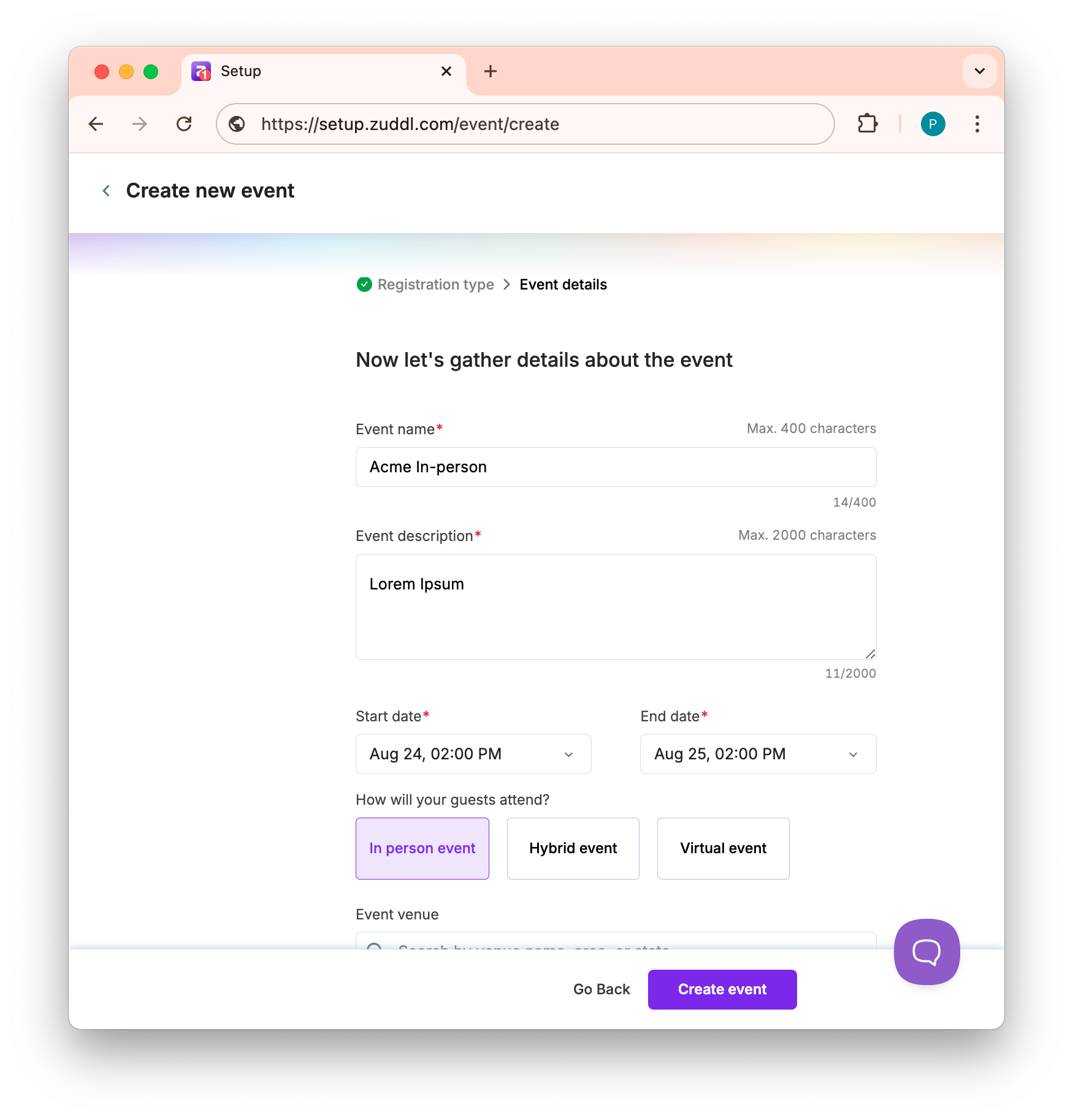 1. Add an Event Name (of up to 50 characters). This event name is displayed on the event listing and registration page.