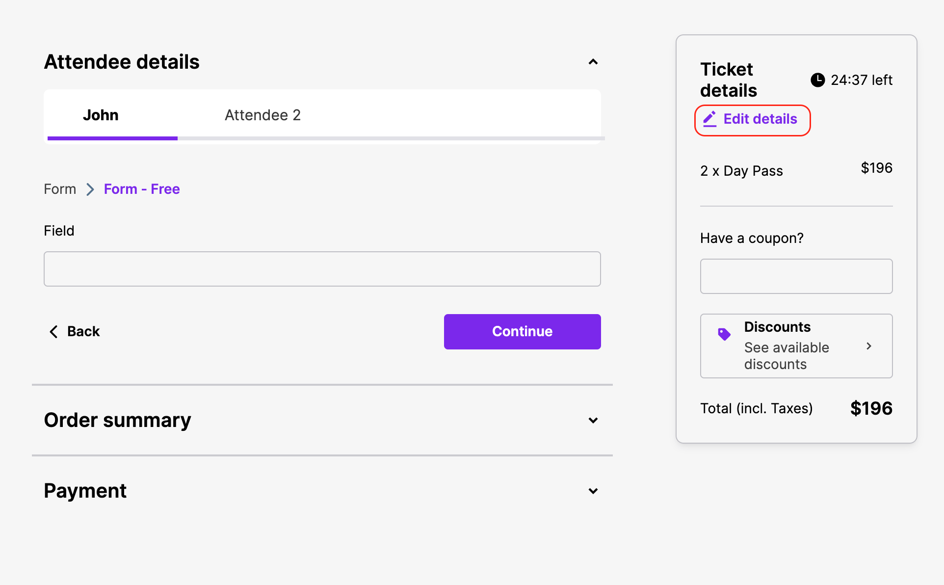 Reducing the number of tickets using the Edit details button will remove attendees starting from the last added attendee.