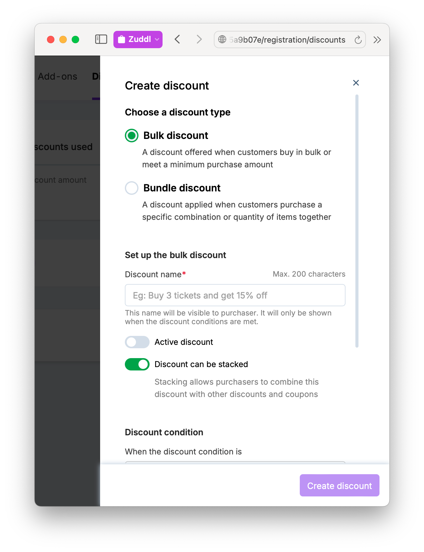 Toggle off/on Discount can be stacked option. This option is only available for events with Zuddl native ticketing. The stacking functionality is turned on by default for all events. Reach out to support@zuddl.com to have this enabled for your event. Learn how to use stackable discount.