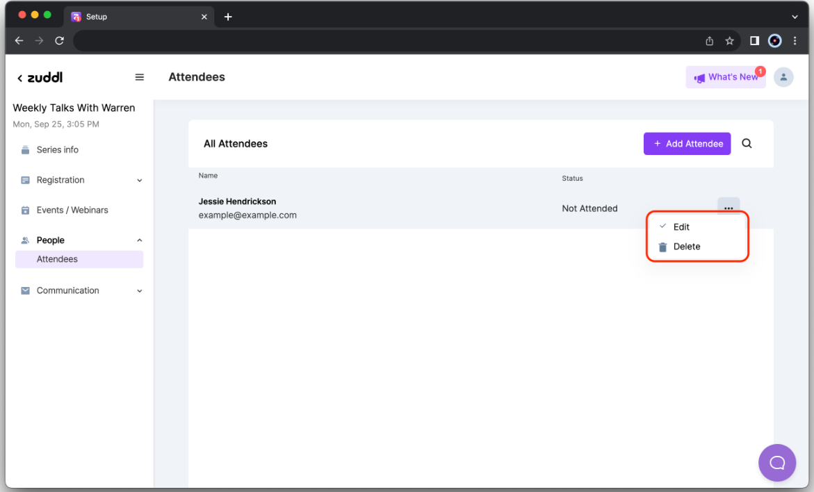 To edit details or delete the attendee from the list — click the more options button on the attendee’s card to access the options menu.
