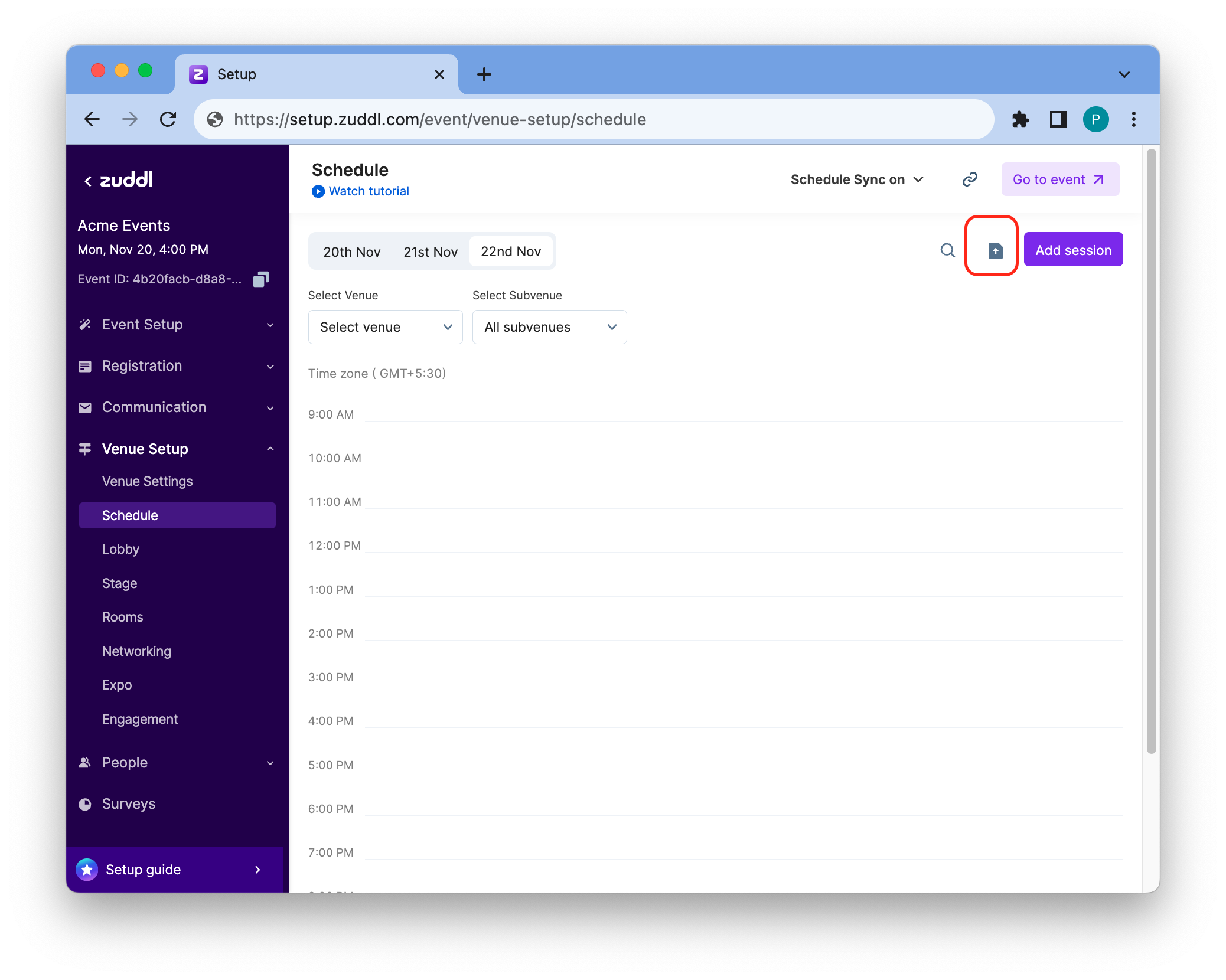 If you already have all the necessary details of all sessions to be added to your event, you can create a CSV file and import it to Zuddl to add sessions in bulk to your Zuddl dashboard.