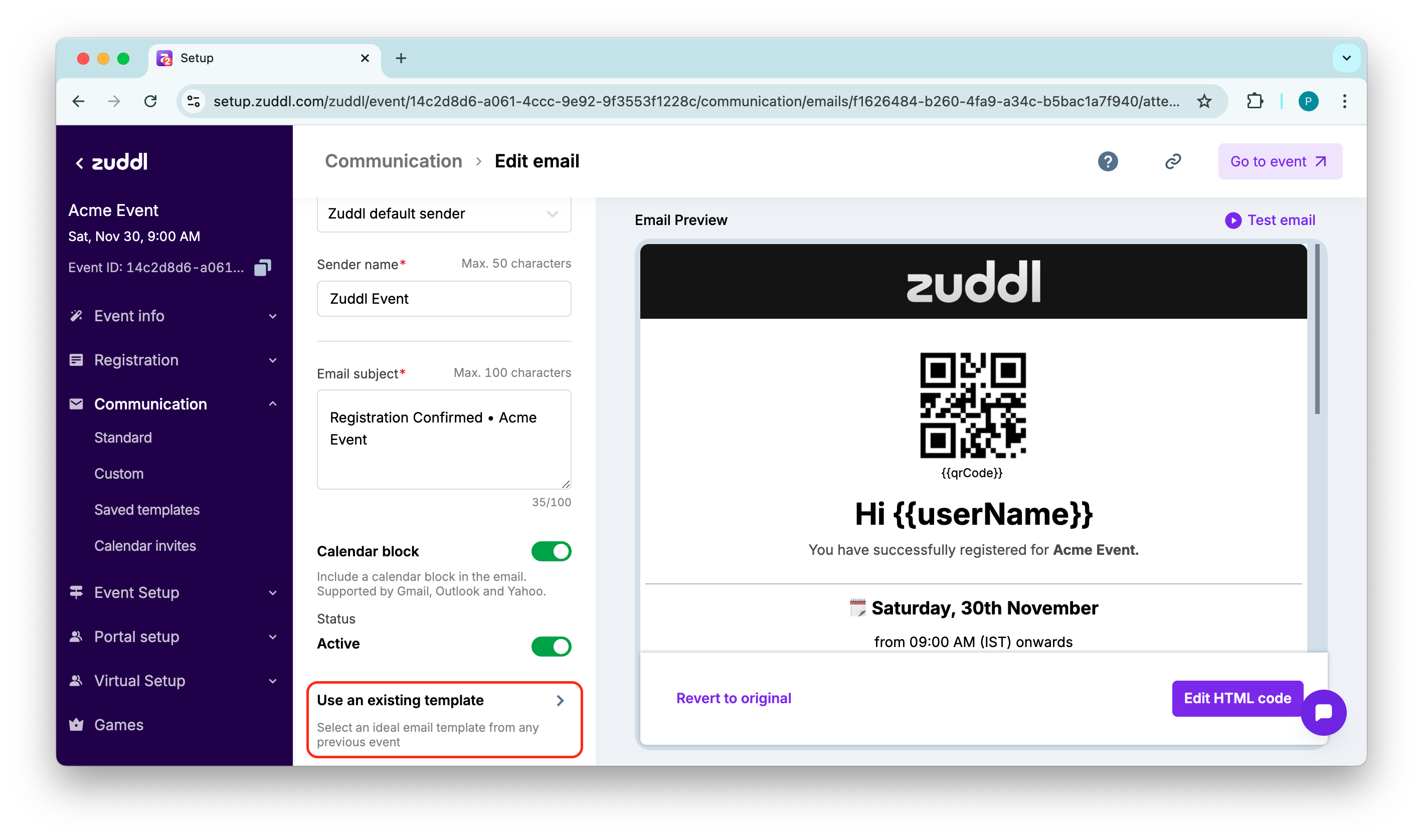 You can edit the default Zuddl email template to customize the email according to your requirements.