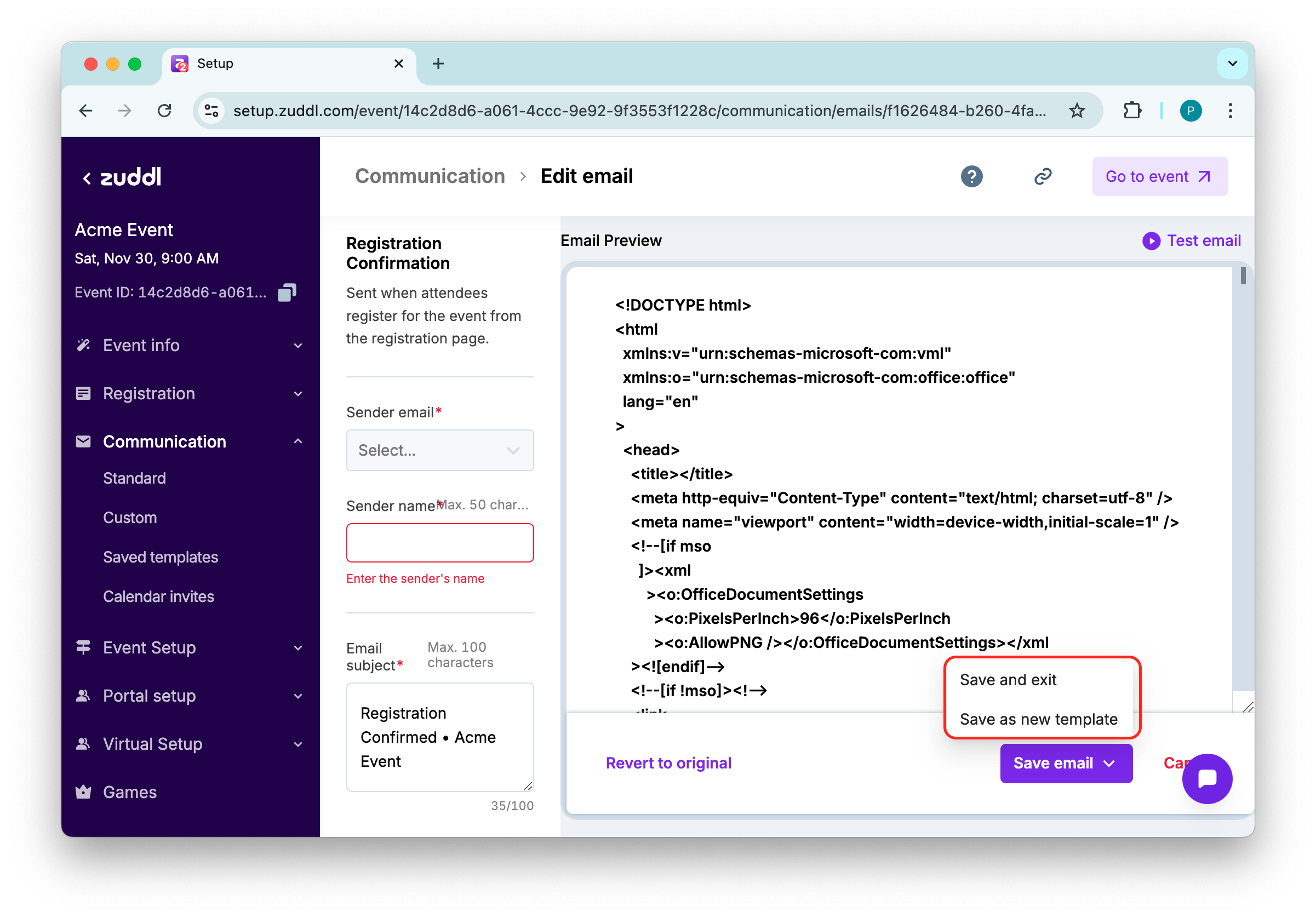 Save email template: This option lets you save the modified email as an event-level template or global template. To save the template, enter a Template name.