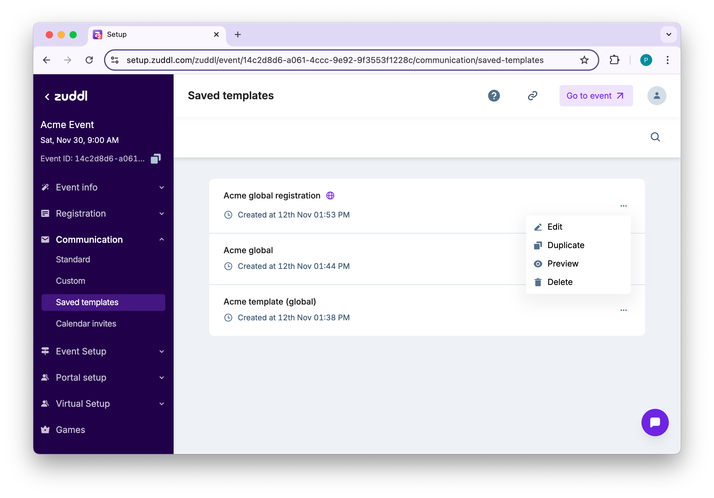 The more options for an email templates include Edit, Duplicate, Preview, and Delete a template.