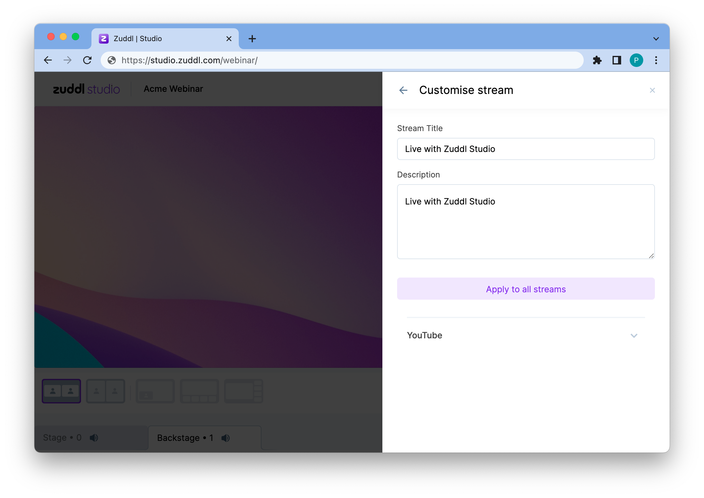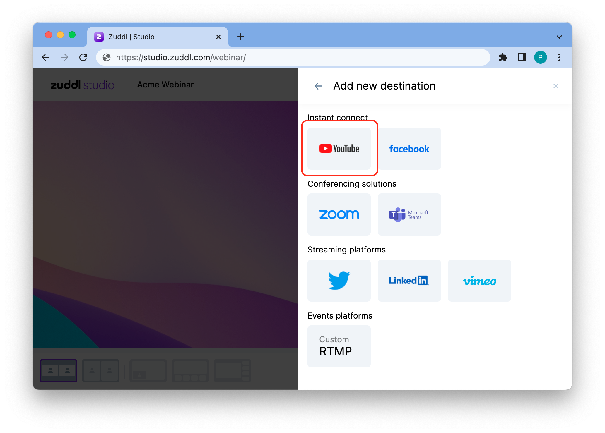 You can directly connect your YouTube channel with Zuddl to stream out to your channel without having to authenticate using RTMP keys. Like a plug-and-play option, you can simply add your YouTube channel as a destination and stream out.