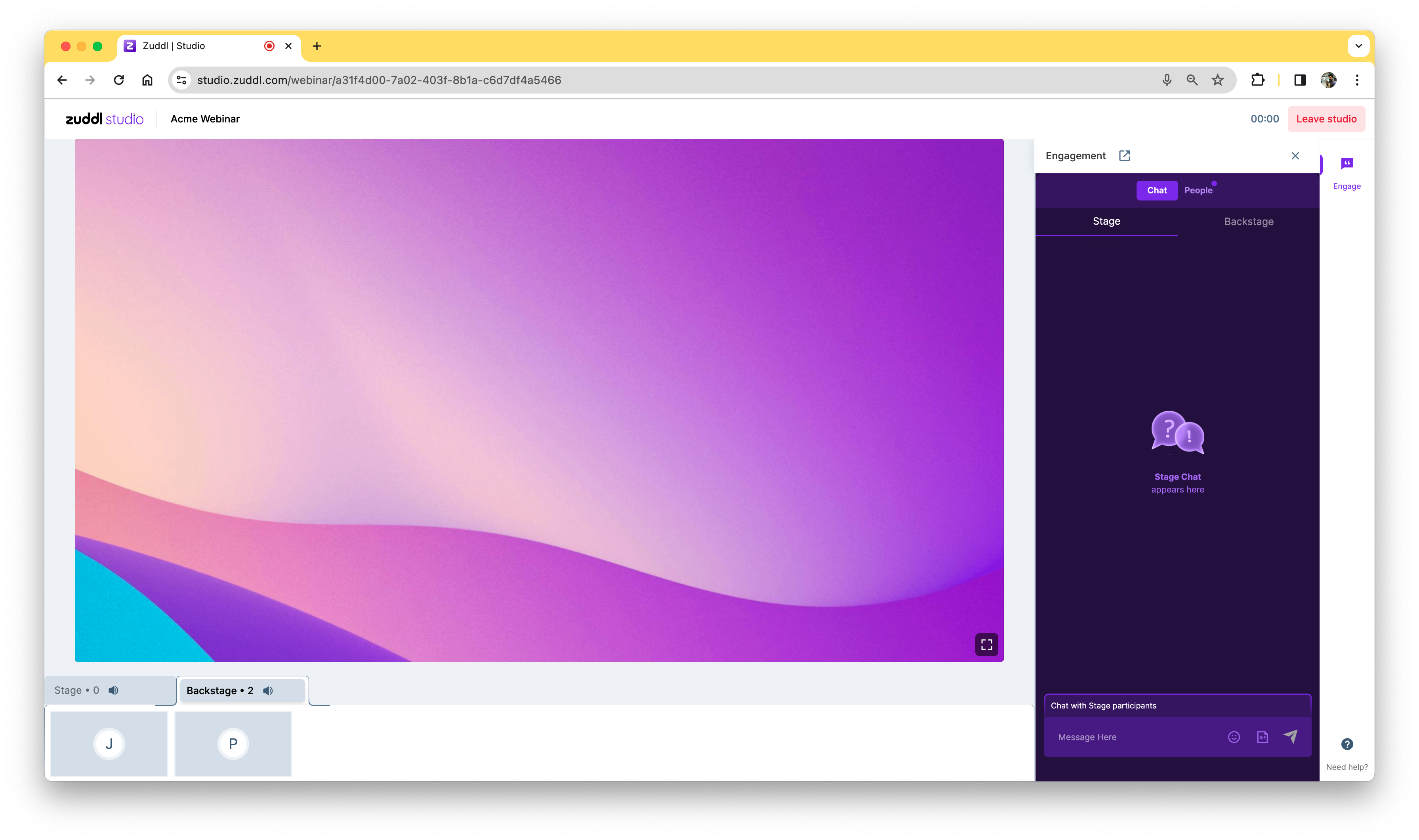 For events and webinars with Studio as backstage, speaker/organizers can switch between Stage and Backstage tab to chat with other participants in the stage or backstage respectively.