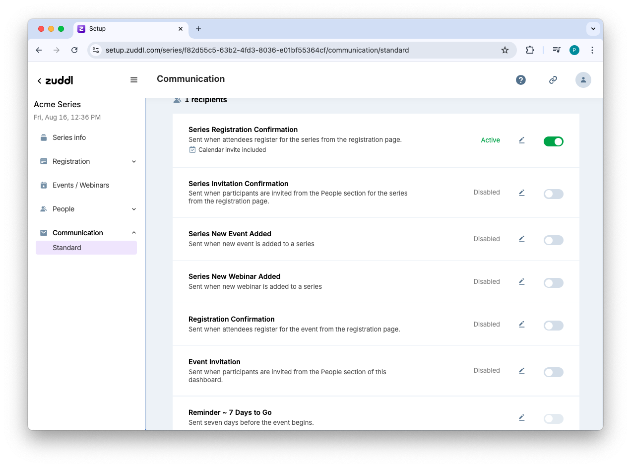 Series New Event Added | This email will notify attendees when you add a new event to the series. | Off |