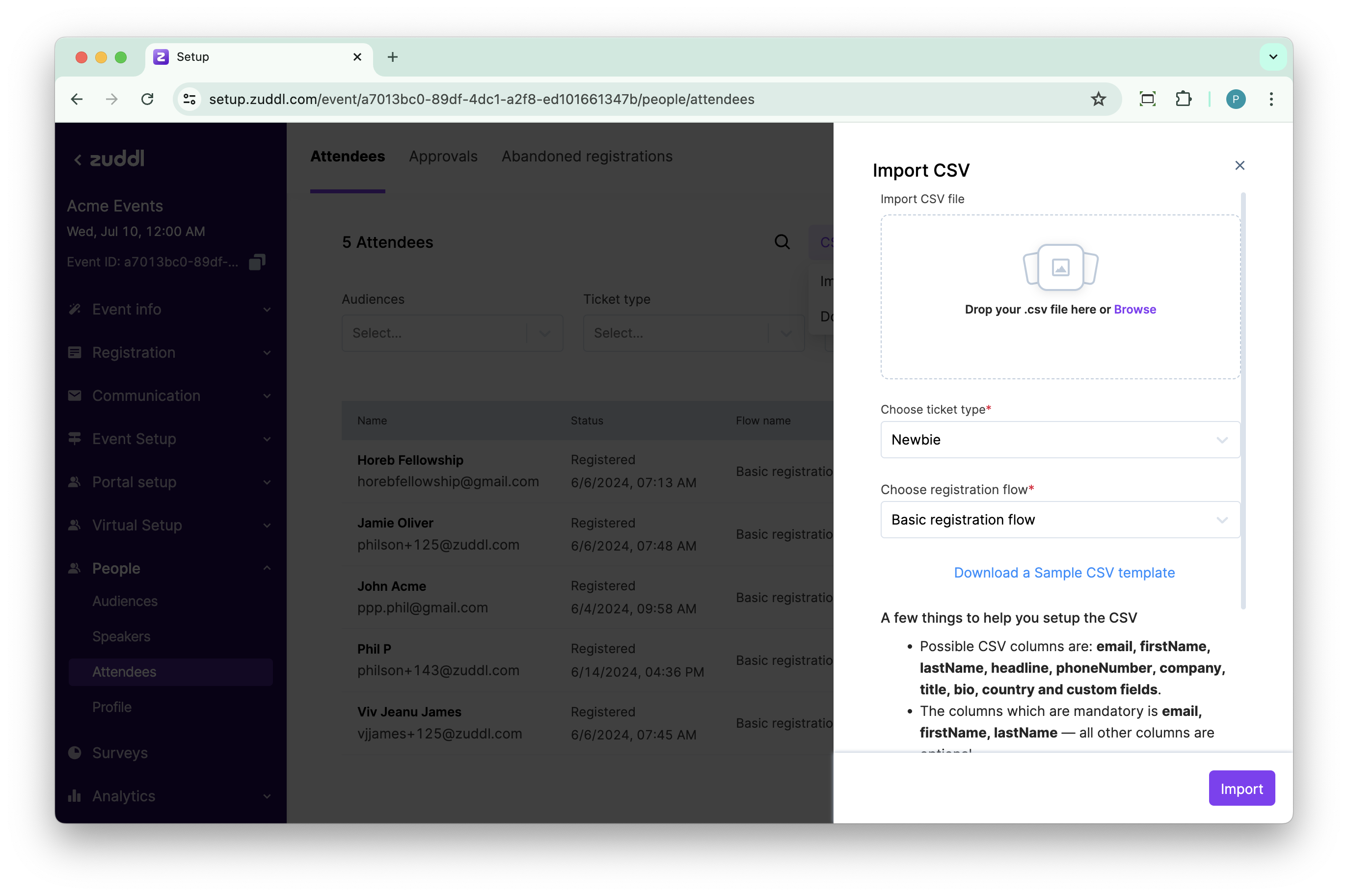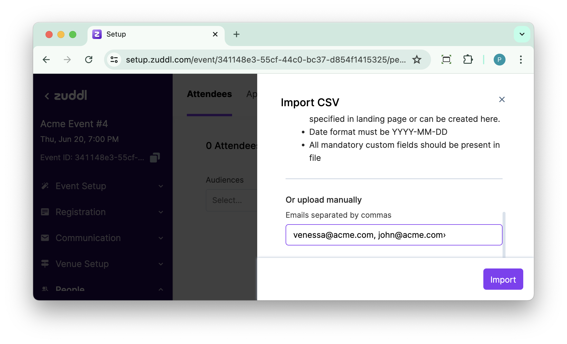 You can add multiple attendees to an event at once by uploading a CSV (comma-separated values) file that contains the necessary details of all attendees.