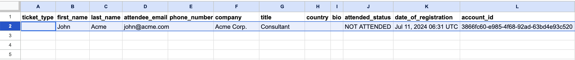 - The default CSV columns are: attendee email, first_name, last_name, headline, phone_number, company, title, bio, country, flow_name, and custom fields. The columns which are mandatory are attendee_email, first_name, last_name — all other columns are optional.