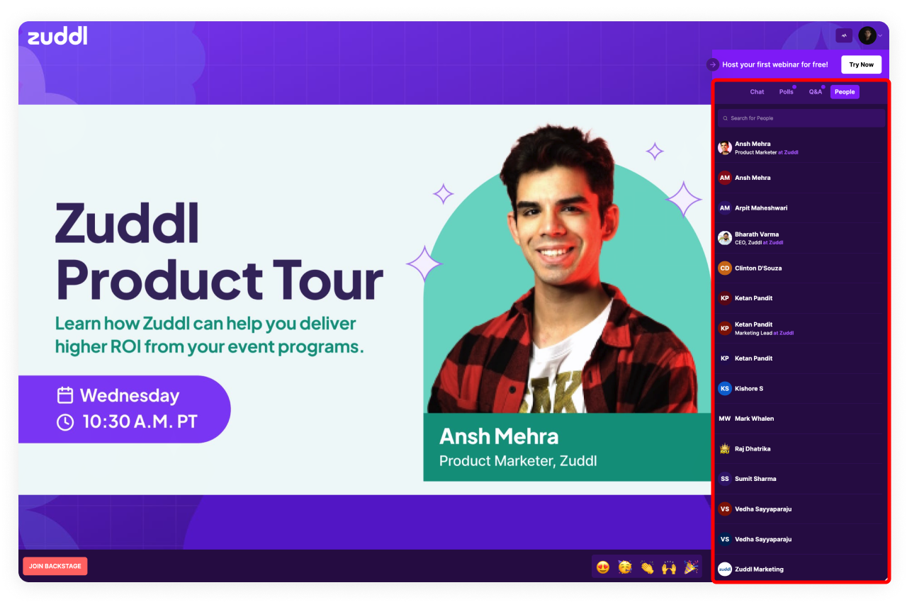 The People feature lets attendees see the names of other attendees in the live webinar. They can also search for attendees using the search bar.