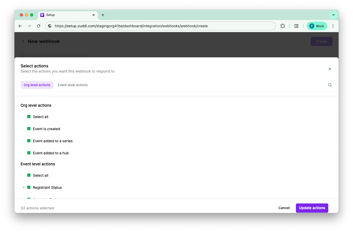 Now, click Update actions to select one or more org-level and/or event-level actions.