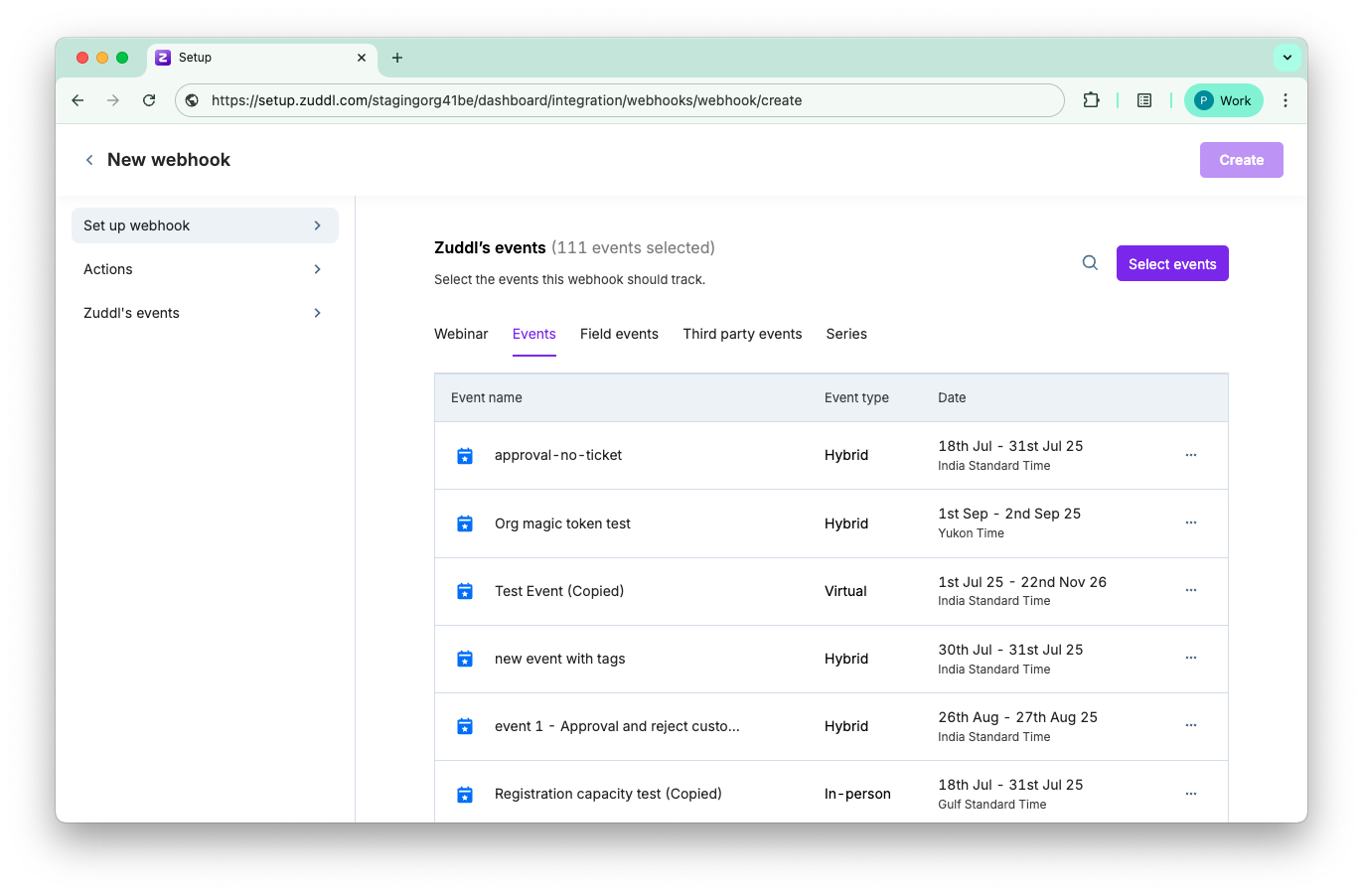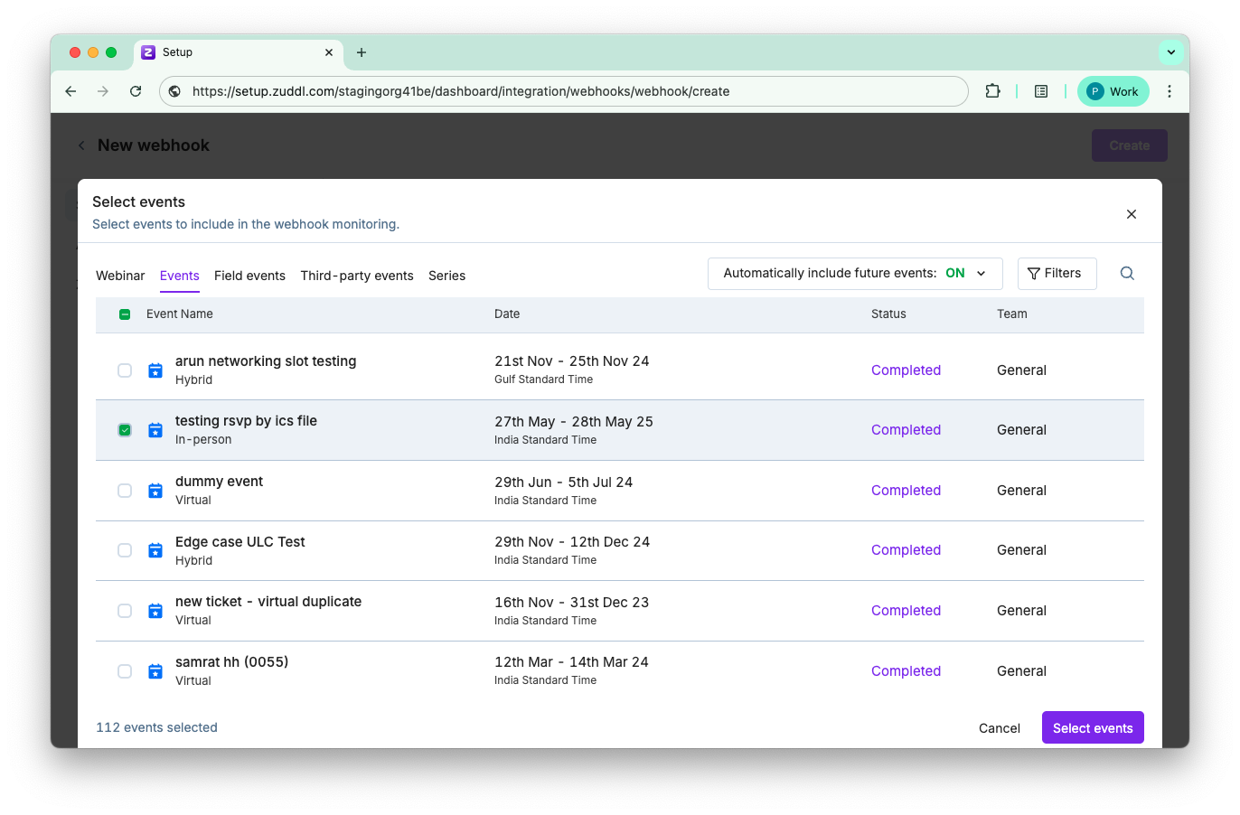 Next, you must select the events for which you need the webhooks to track action. Click the Select events button to select the required events from the list of events in your Zuddl organization.