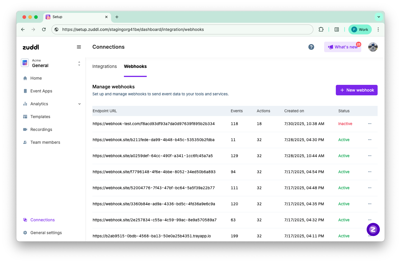 From the Zuddl dashboard, go to Connections → Webhooks tab.