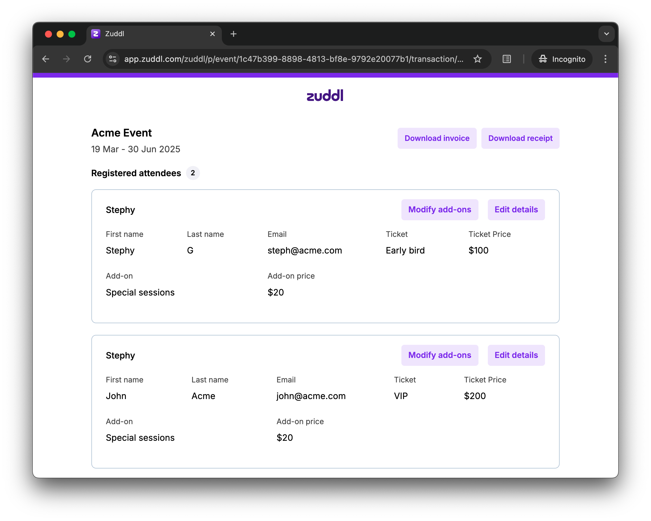 Selecting an add-on is an optional step that you can decide at an attendee-level. For example the purchaser can skip adding the add-ons for the second attendee. The same will be reflected in the order summary and the invoice.