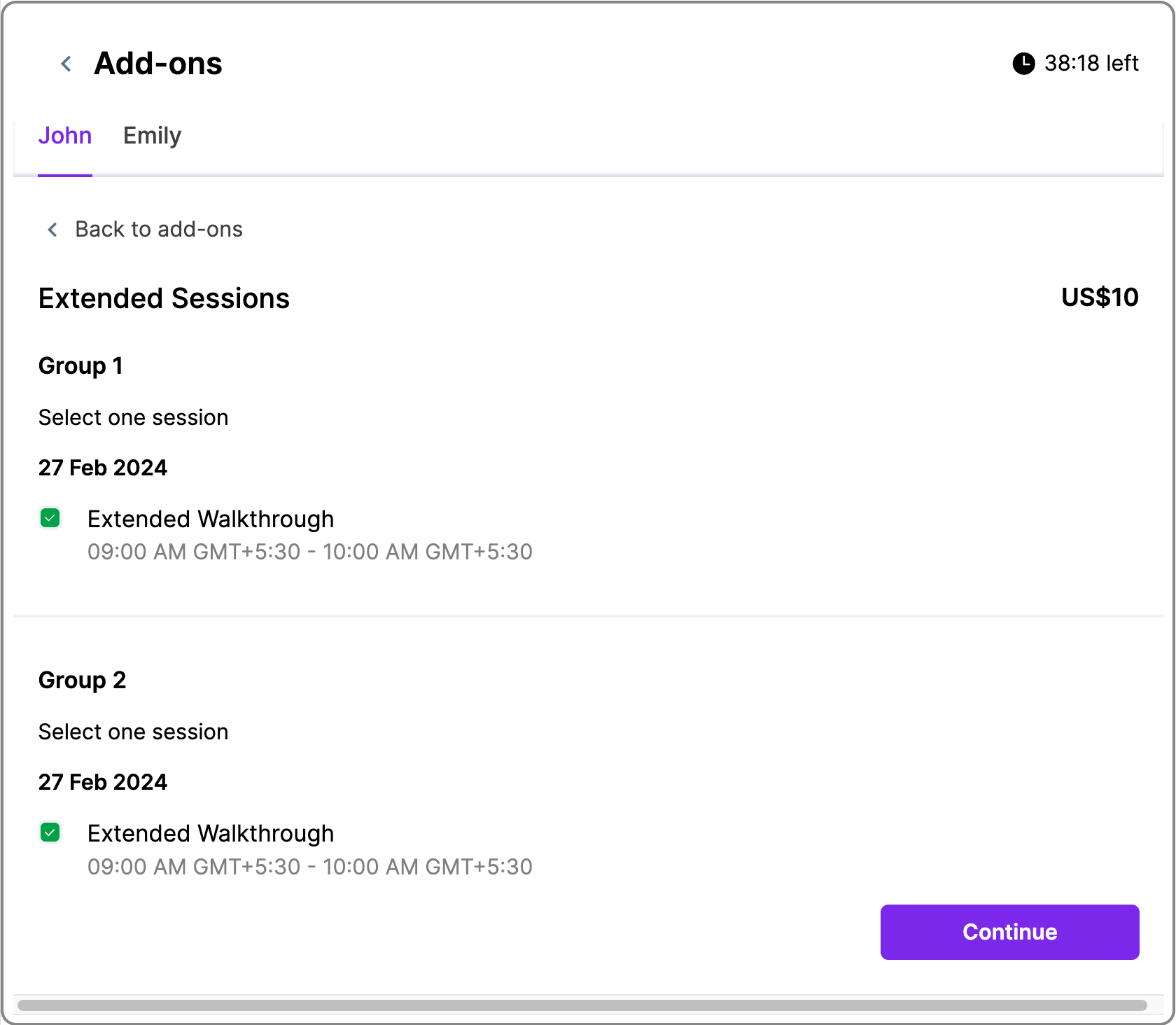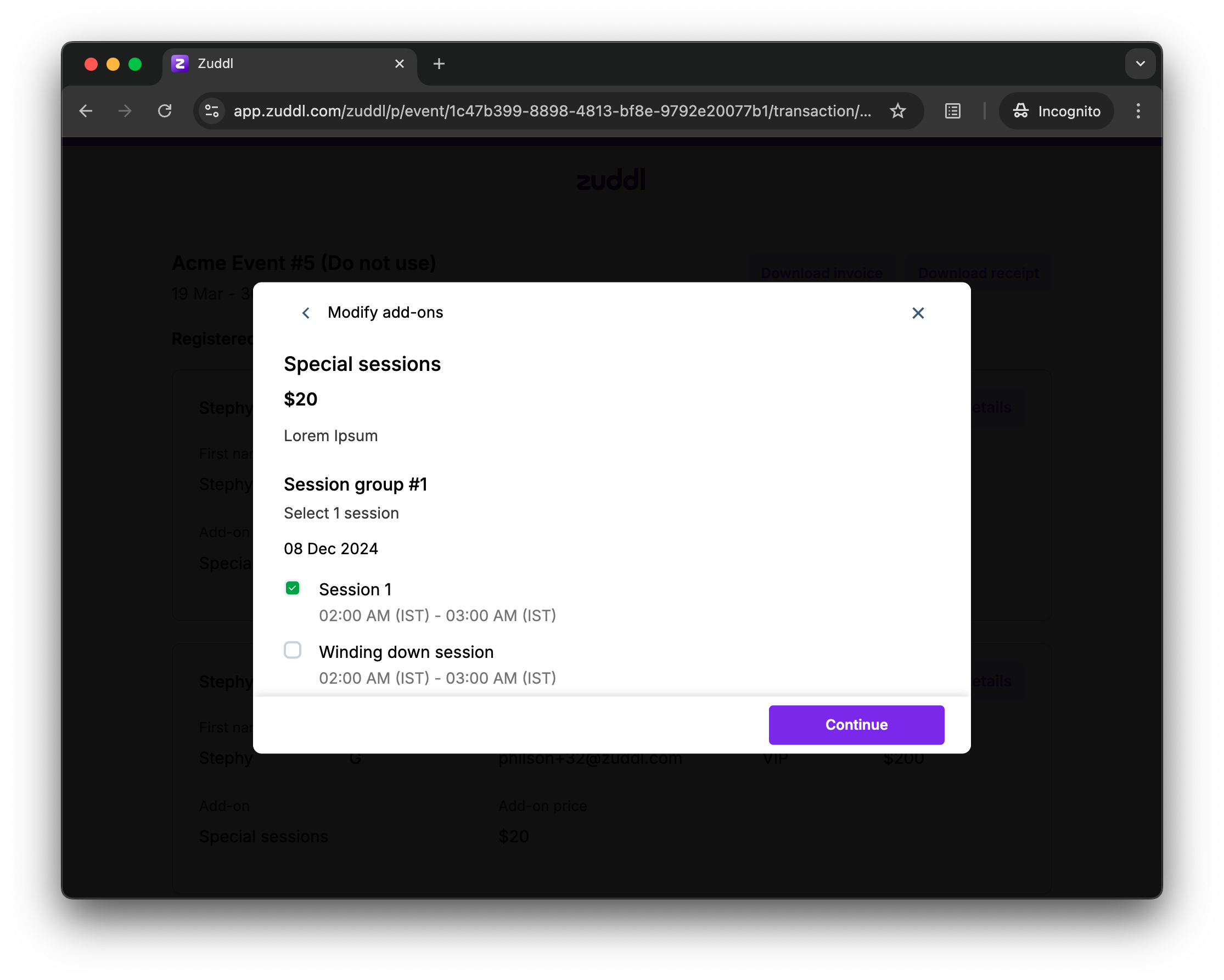 Clicks Continue. This applies the add-on session access for the said attendee.