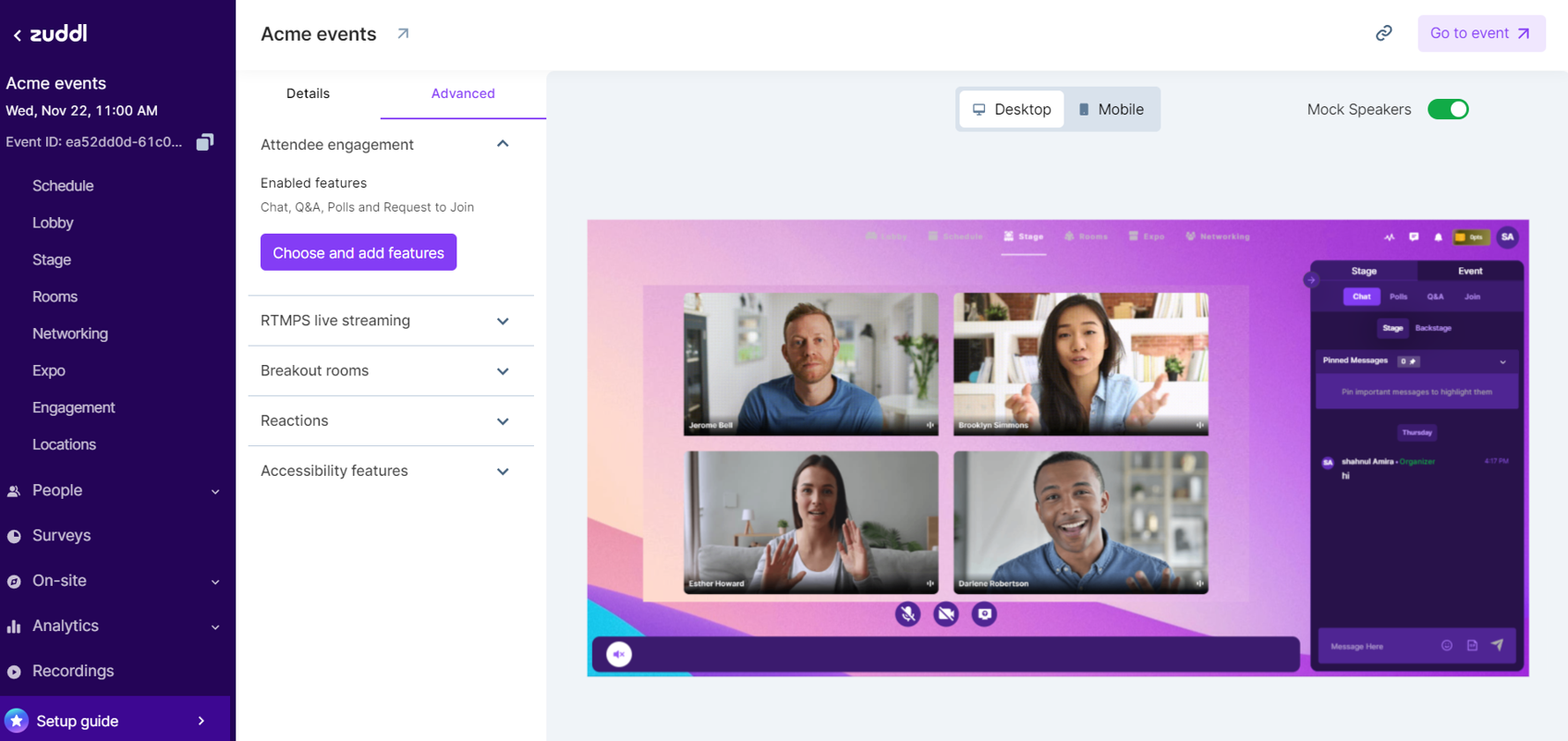 Click on the Advanced tab. Under the Attendee Engagement menu, click the Choose and add features button. This shows all the interactivity options that you can configure.