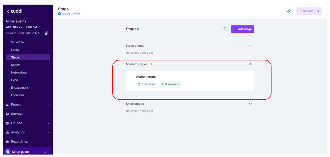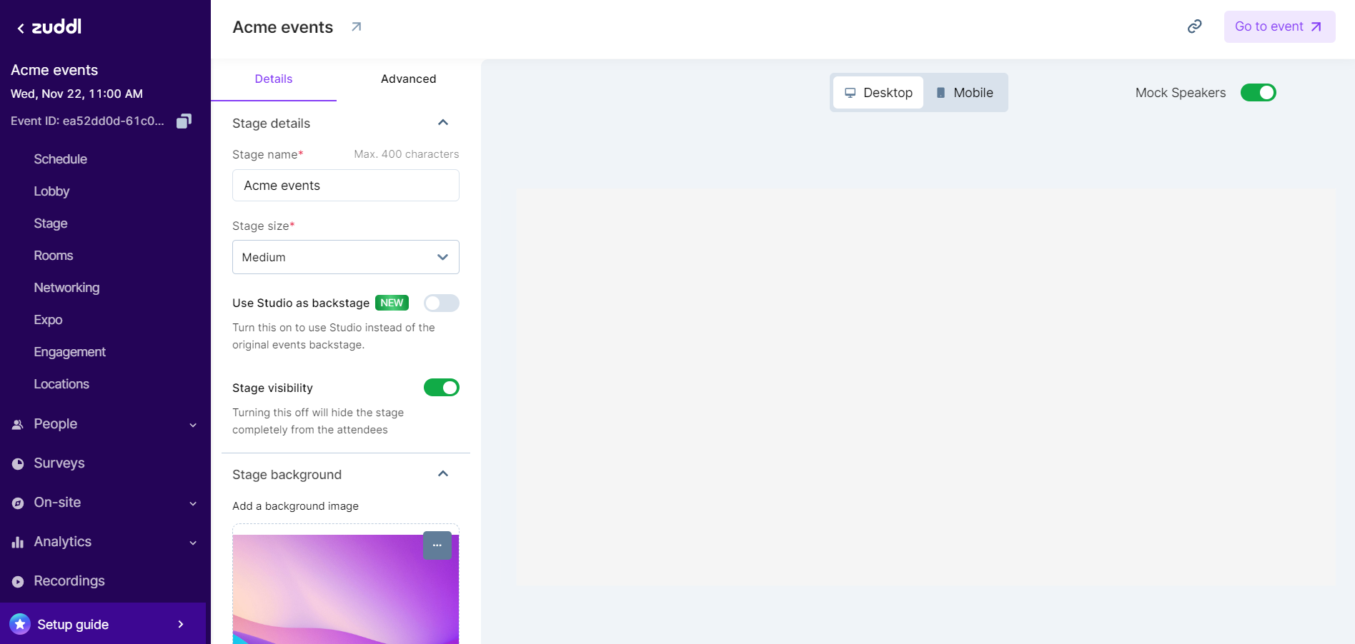 A separate section called “Enabled features” lists the features that have been enabled for the event.