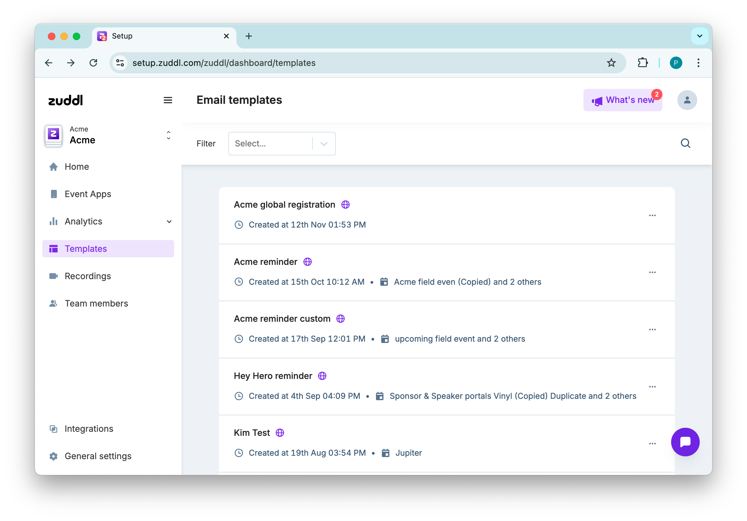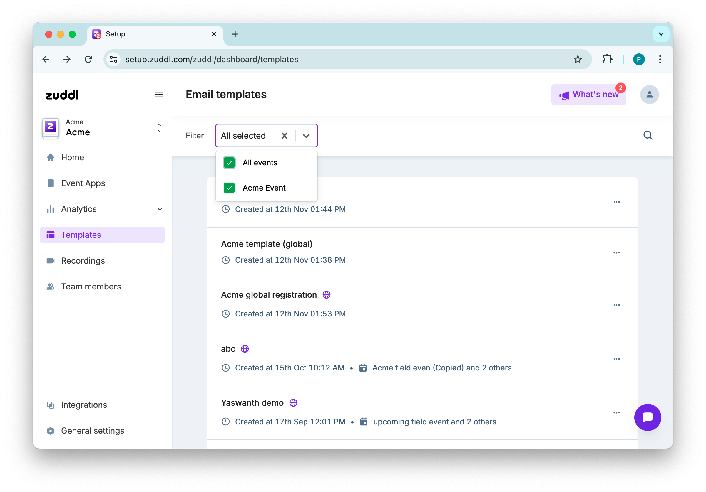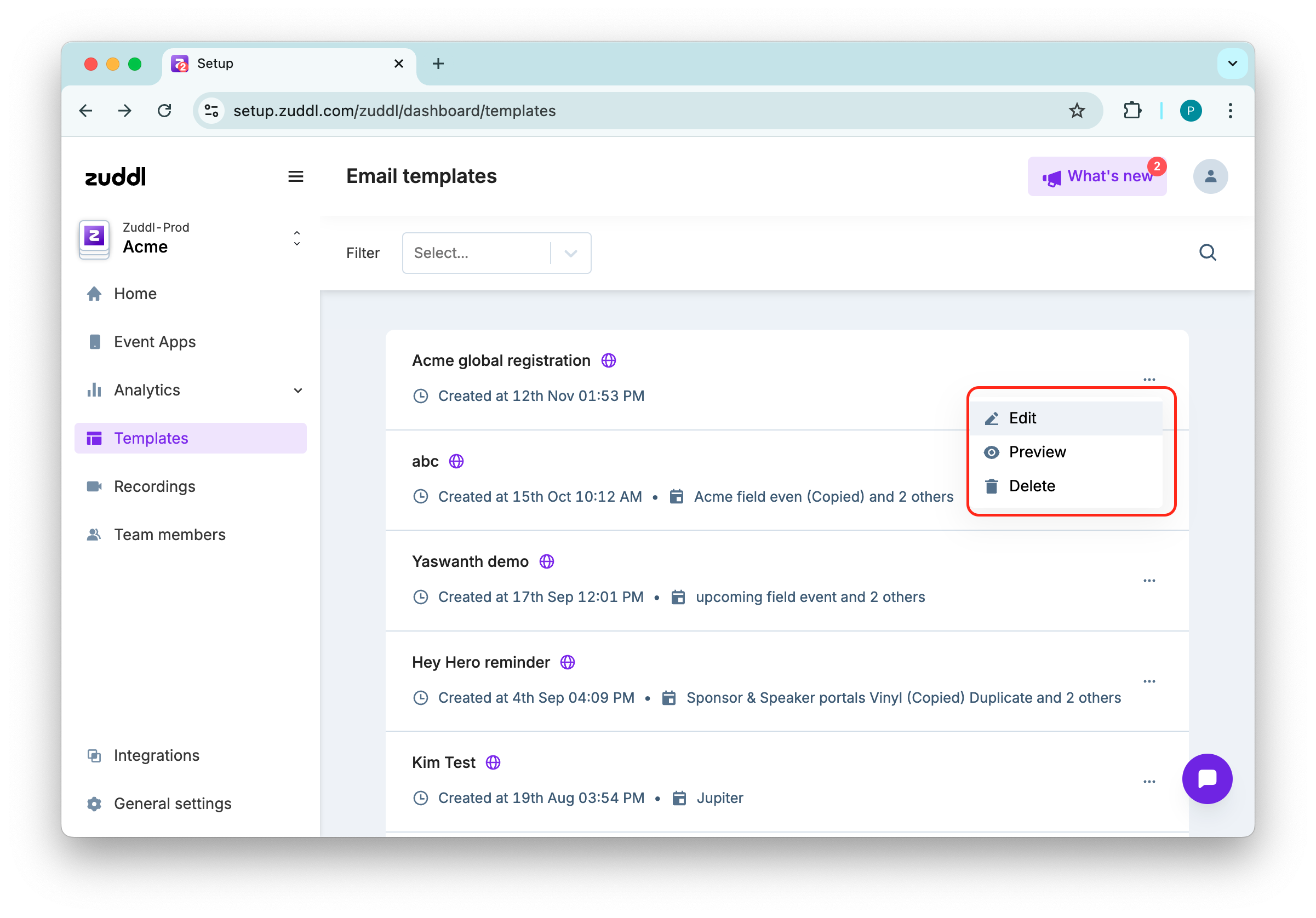 Search for the global template you wish to edit. You can also filter the list based on the events. By selecting an event, all templates are shown; event-level and global templates.