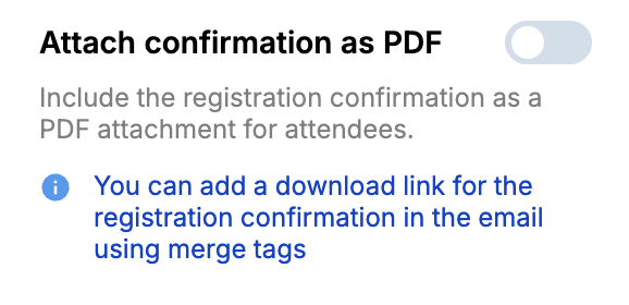 You can also toggle on the Attach confirmation as PDF to include the registration confirmation PDF attached to your email for attendees. Alternatively, you can choose to disable the email attachment and add a download PDF link in the email body. This download PDF link can be added using a special link in the email builder. Learn how to use the special link.