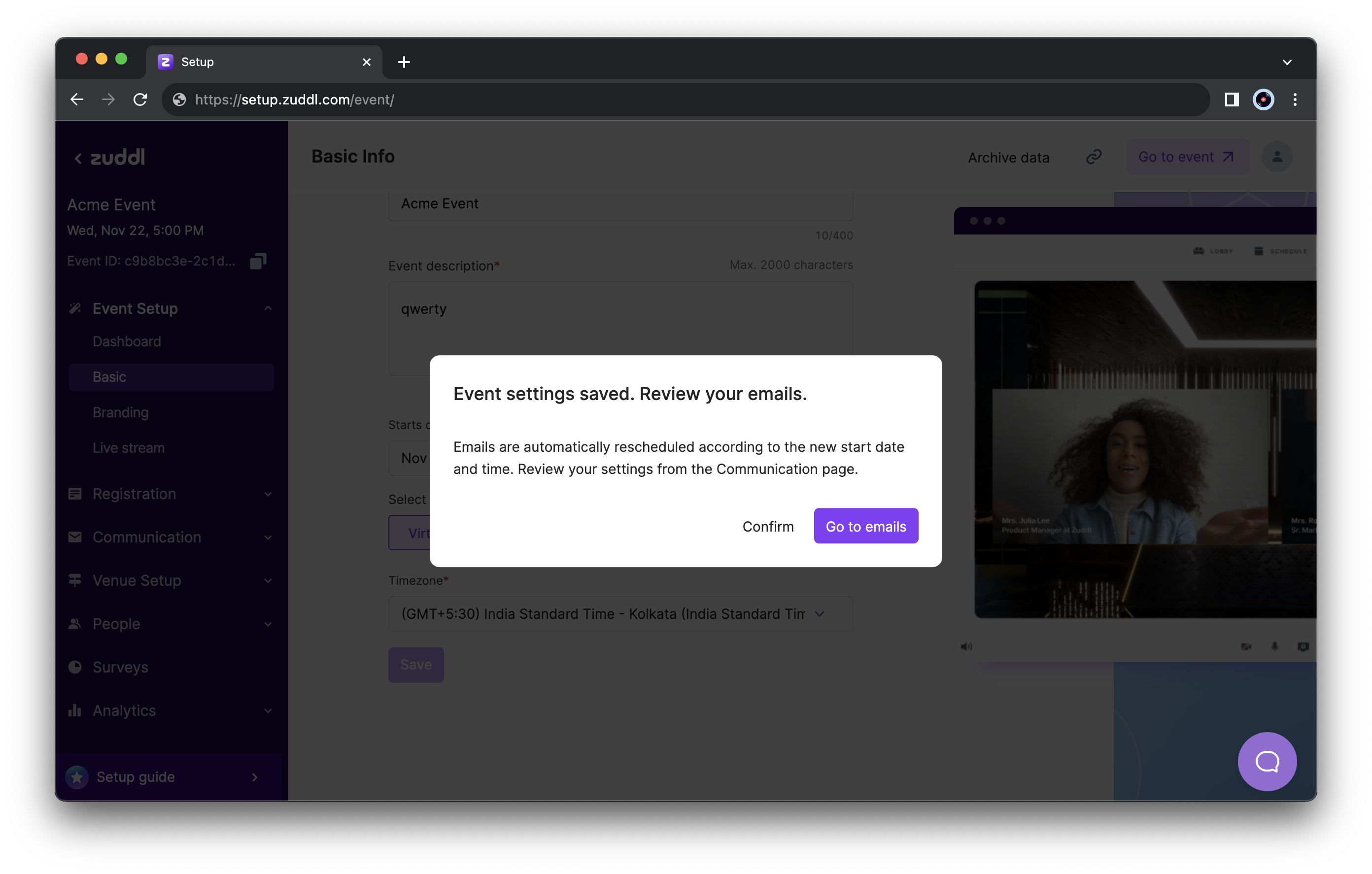 So, if your registration confirmation email was toggled on, it gets turned off when the event dates are modified. You will be notified of this change via a popup or an email. This resetting is done to prevent any accidental misfires during trial runs. Conversely, changing the event date or time in the email does not change the event date or timing.