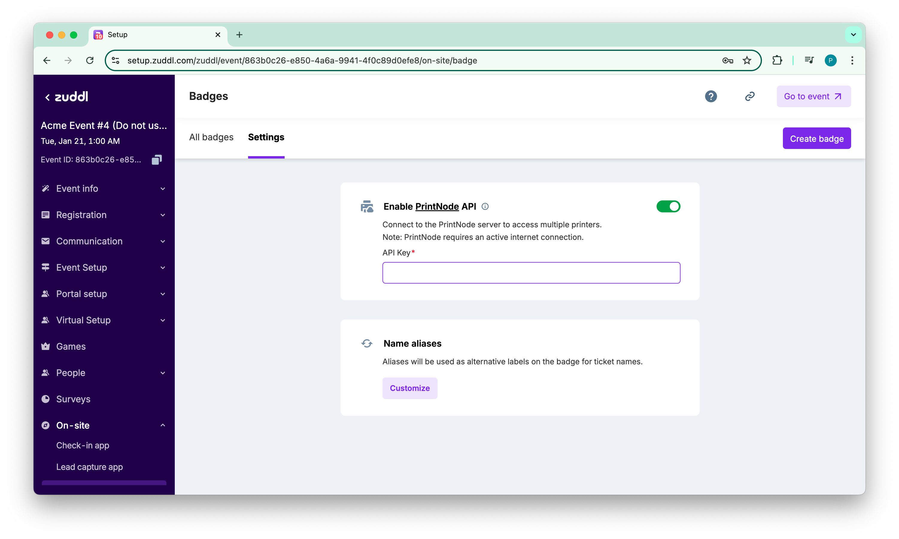 1. In Zuddl’s dashboard, navigate to Onsite > Badges > Settings.