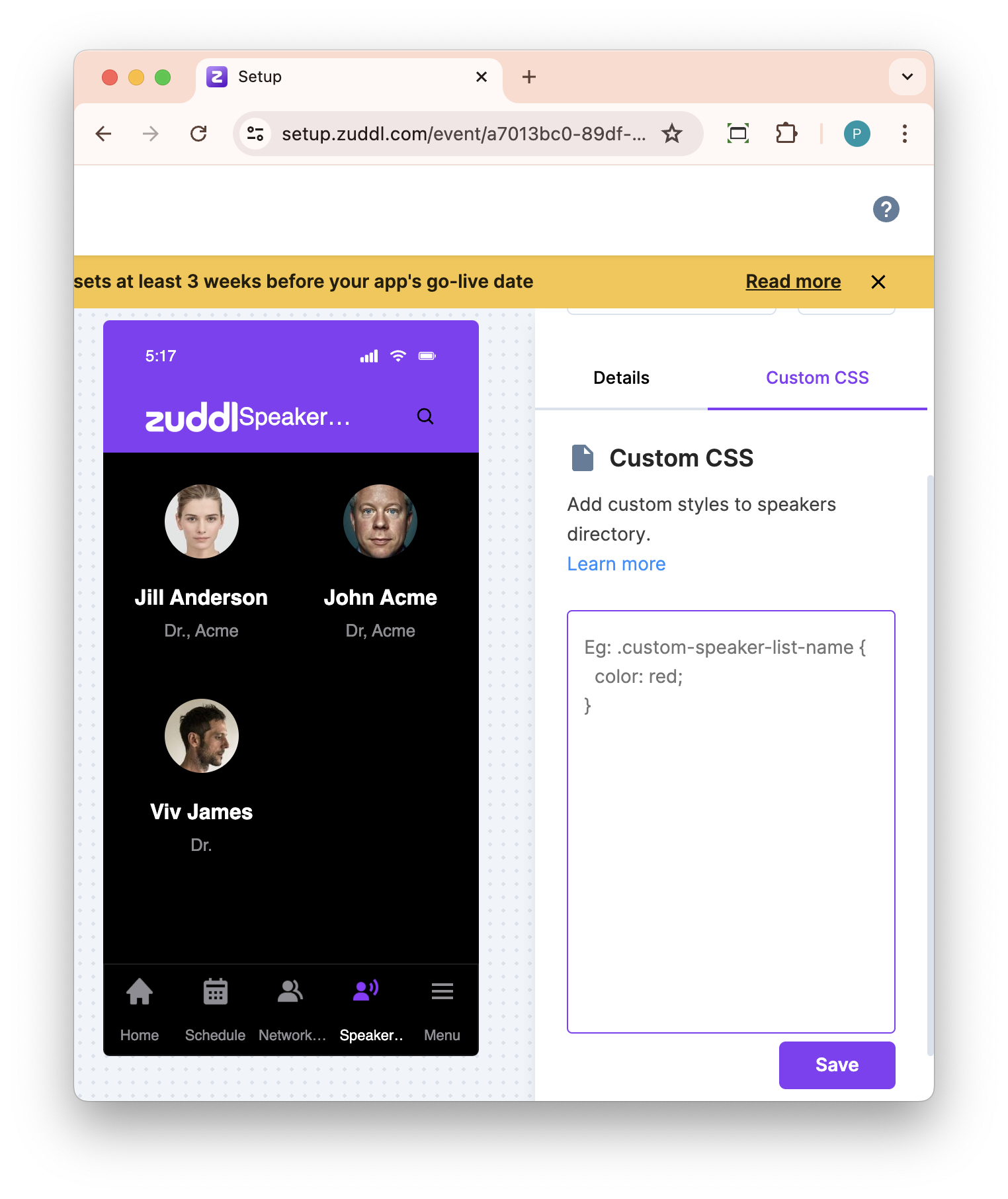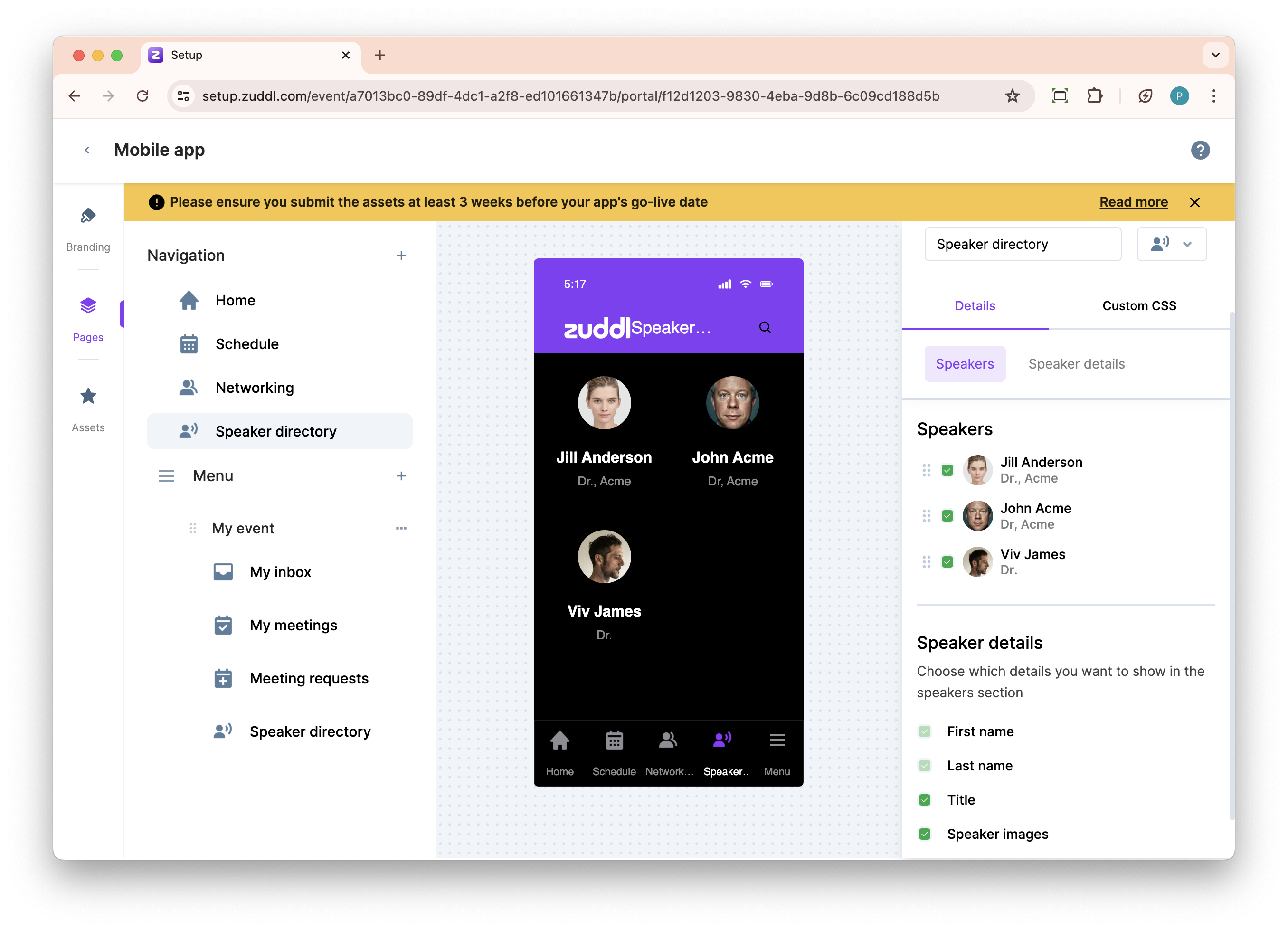 You can set up a speaker directory page which can be customized like the speaker widget to display your event speakers on the Zuddl mobile app. The speaker directory lets your attendees look up a speaker and view their profiles. You can also customize it using CSS. Speaker directory is a part of the standard pages in the navigation menu.