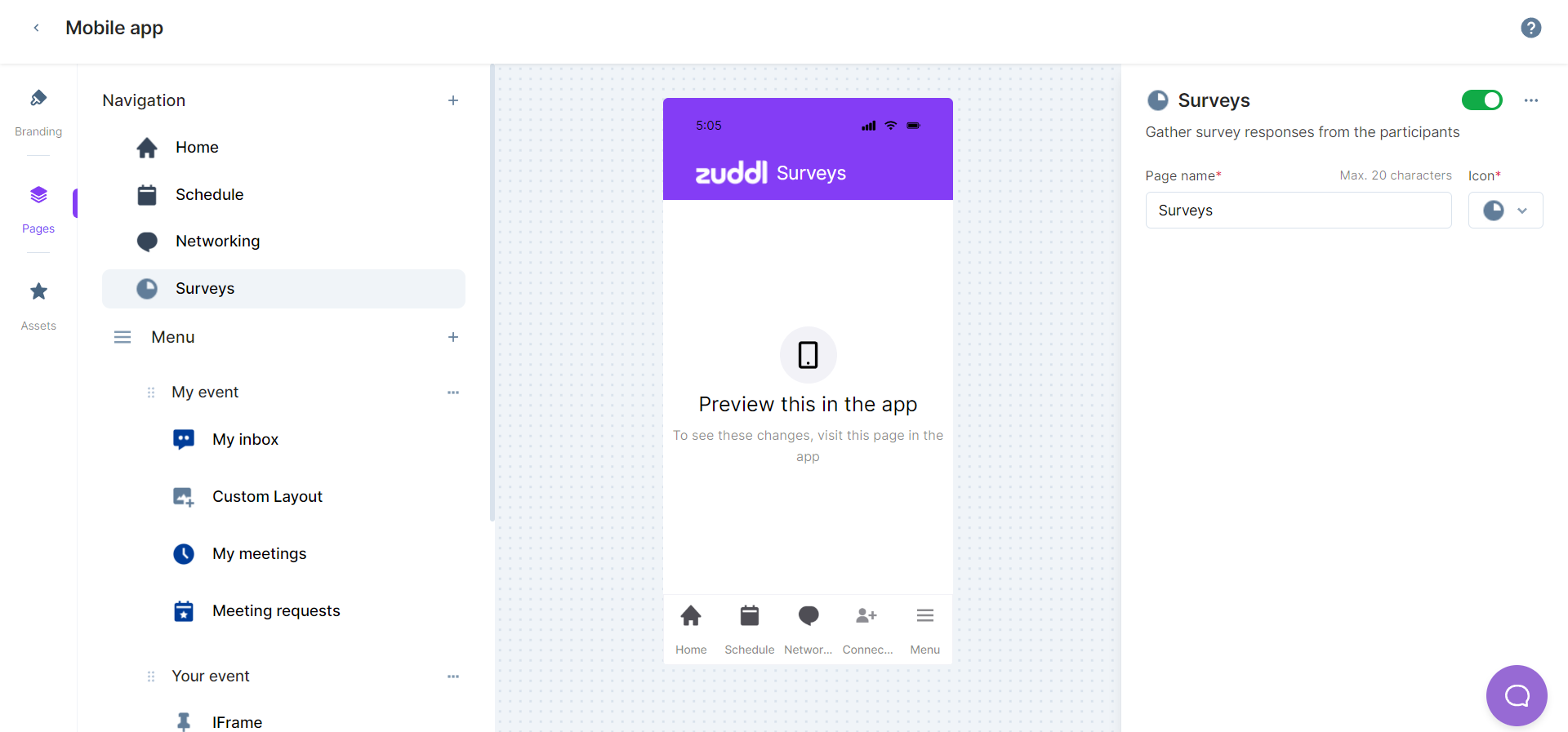 The Surveys page helps to gather survey responses from the participants. Surveys page can be added in the Navigation or Menu sections. To add a Survey page,