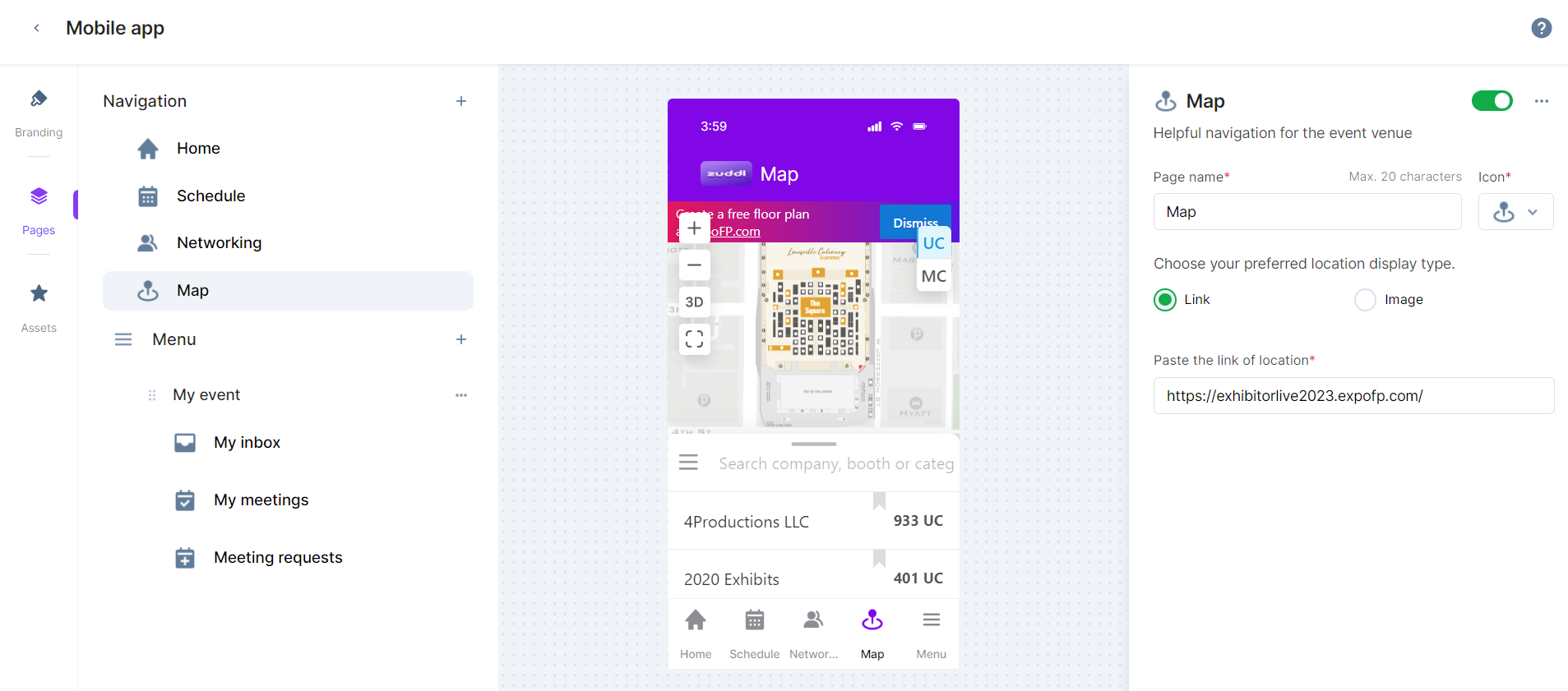The Map page is used to help in the navigation for the event venue. To add a Map to the Menu item: