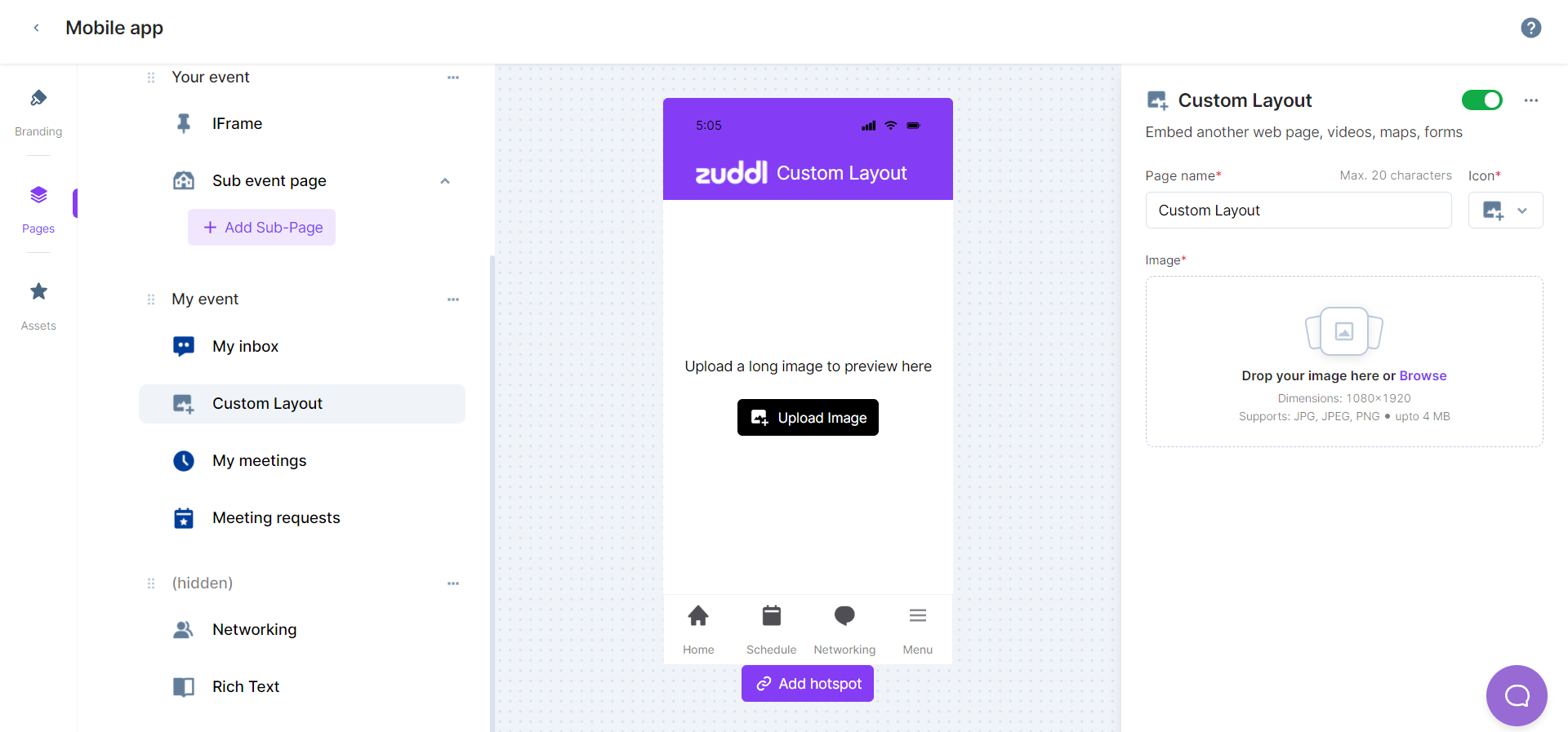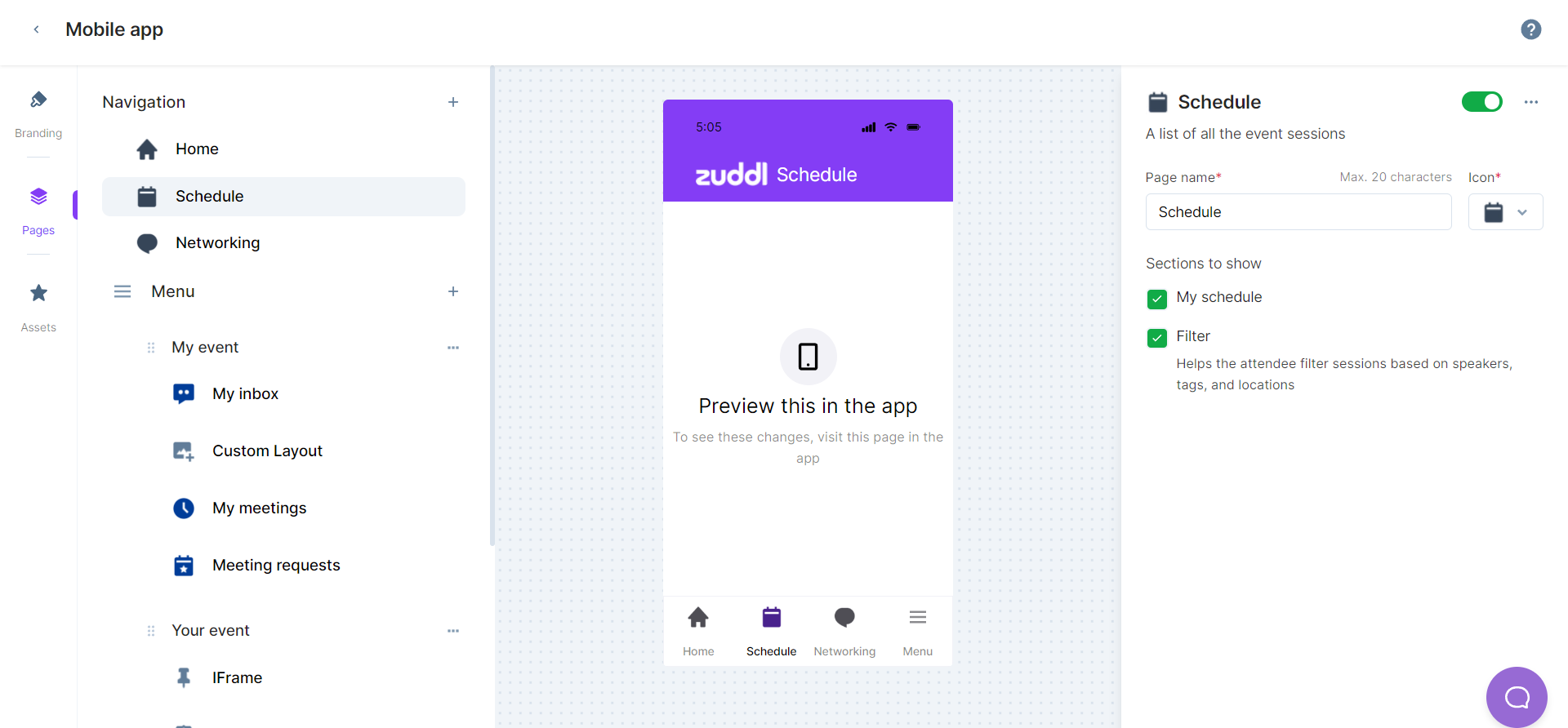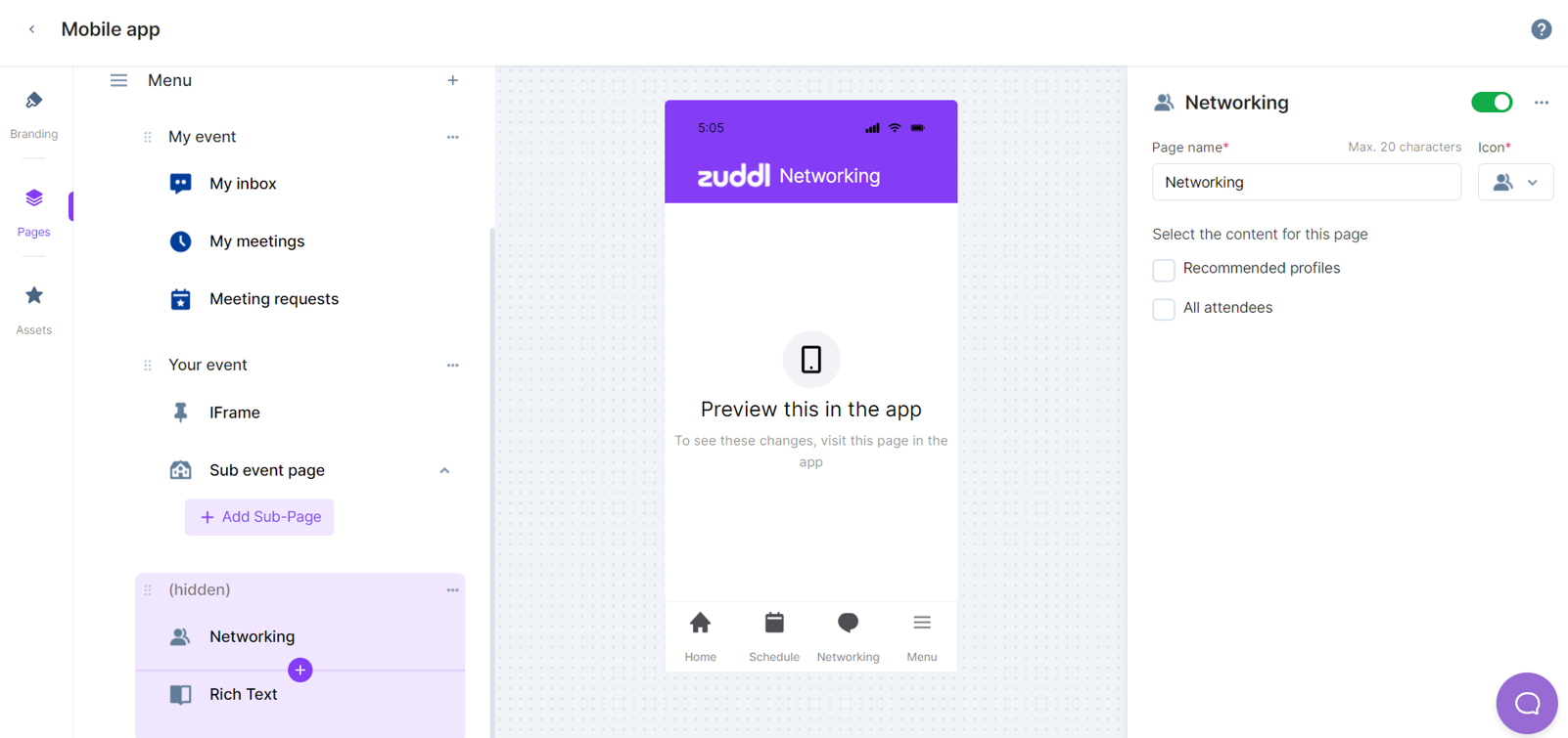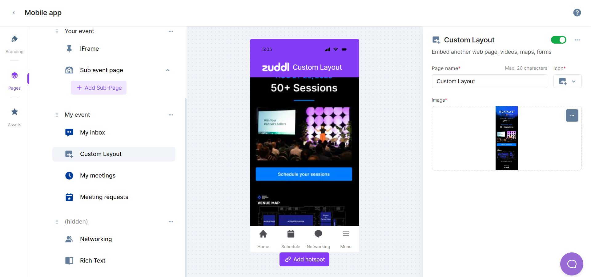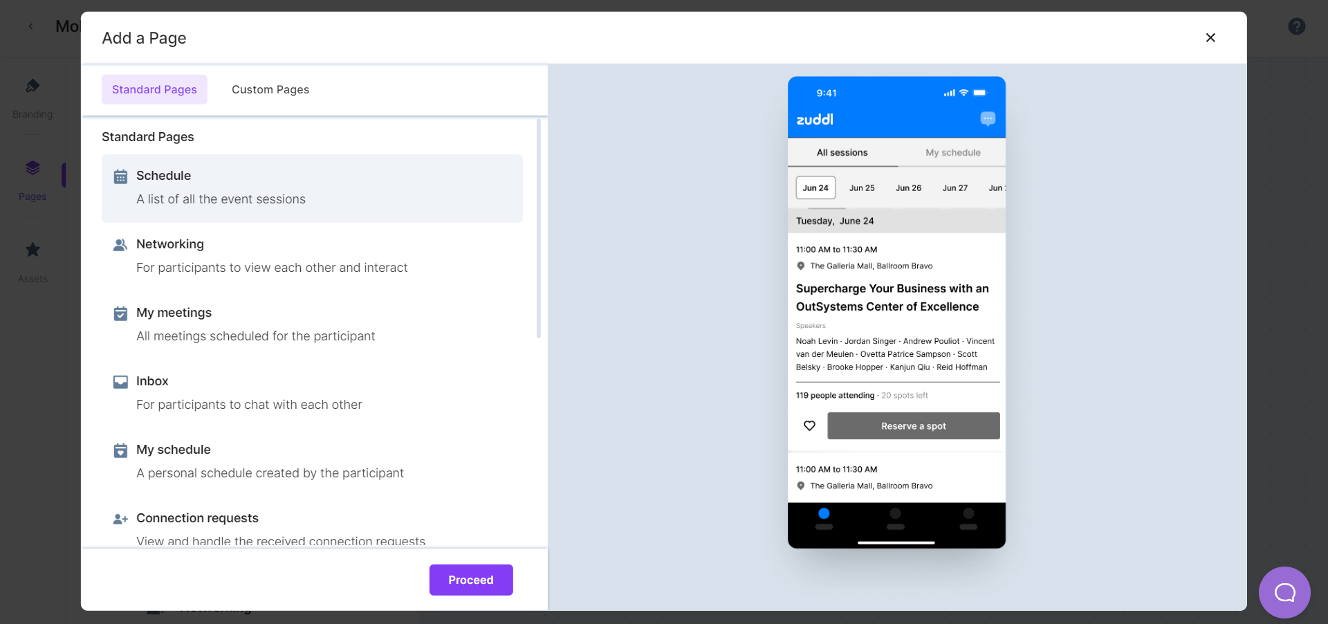 Zuddl Mobile app includes a mix of standard pages provided by Zuddl and custom pages like iFrame or rich-text pages to meet specific requirements and provide a unique user experience.