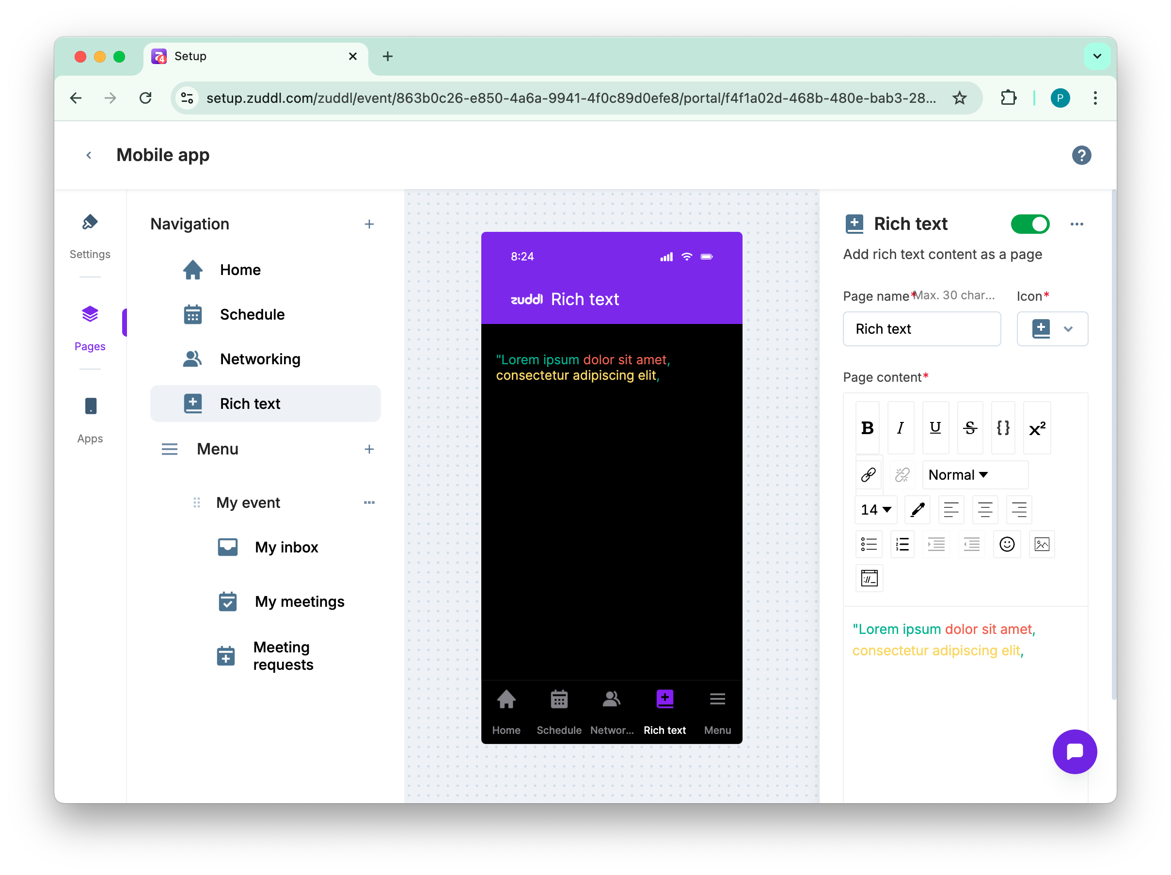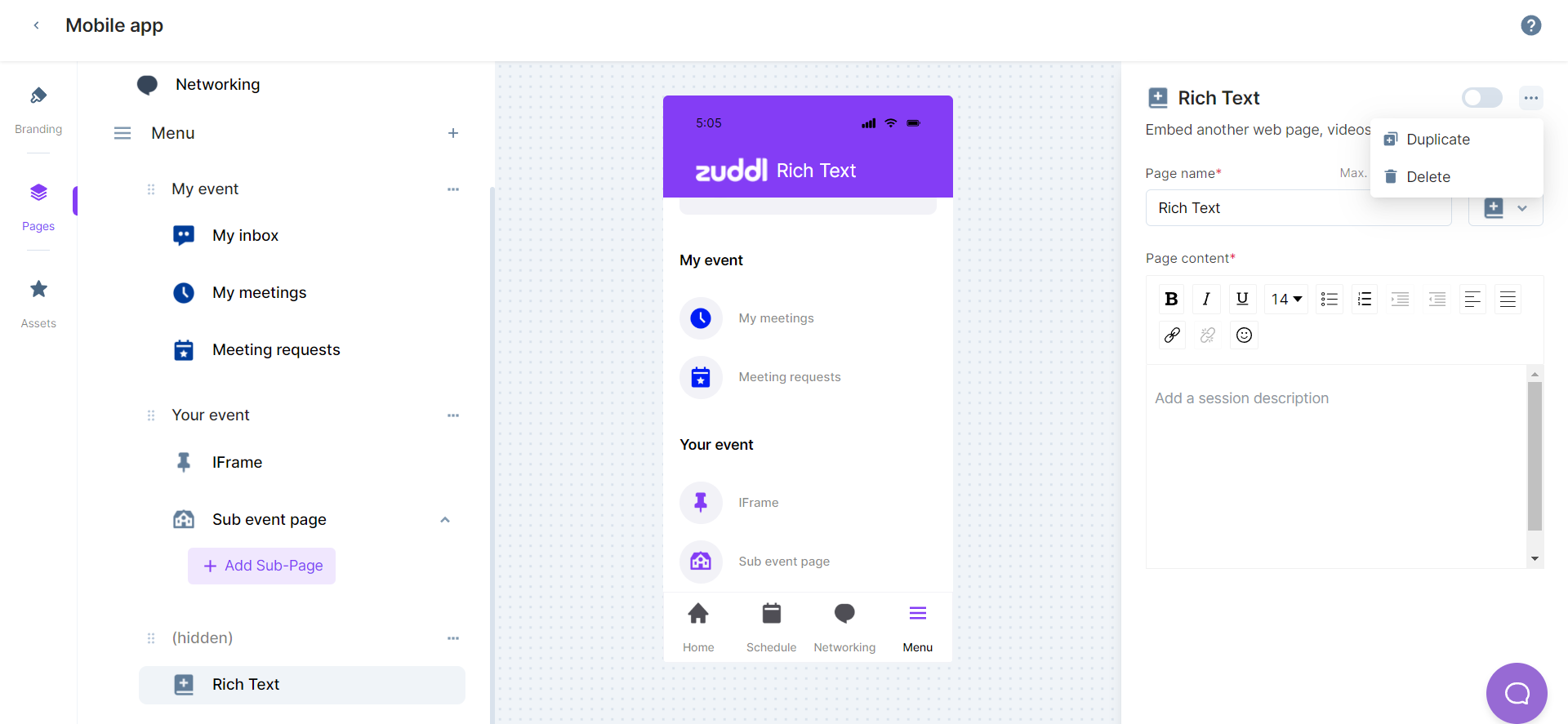Click Rich text page from the list of custom pages. The Rich text page gets added under the hidden section, but on the app, you can see it under an event section with a name.
