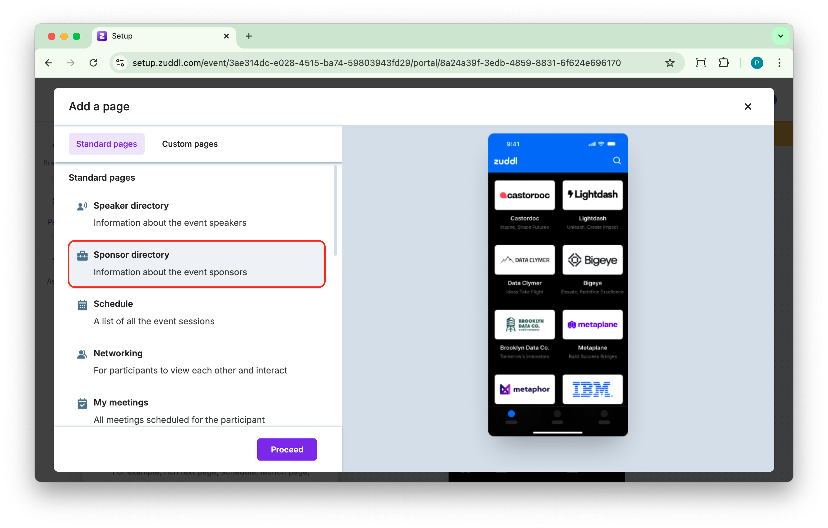 Under the Standard pages tab, click on the Sponsor directory page and click on the Proceed button. This adds the sponsor directory page to the menu.