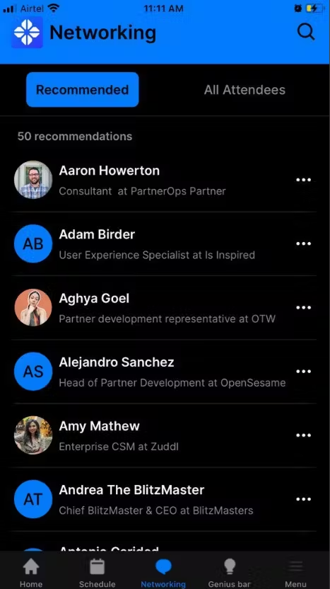 The networking page is used for participants to view the recommended profiles by Zuddl and also view the complete list of participants. Attendees can select a participant and start a meeting. Networking page is one of the default pages in the Navigation item.