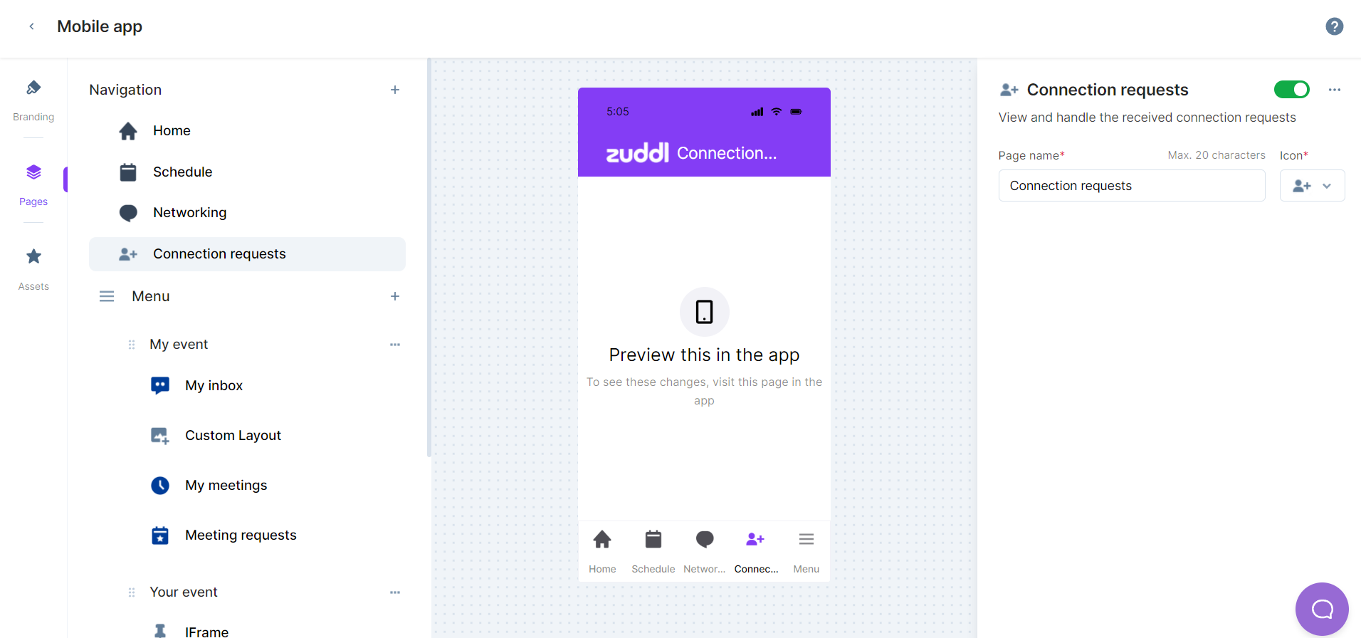 The Connection request page helps to view and handle the received connection requests. Connection requests page can be added in the Navigation or Menu sections. To add the Connection request page,