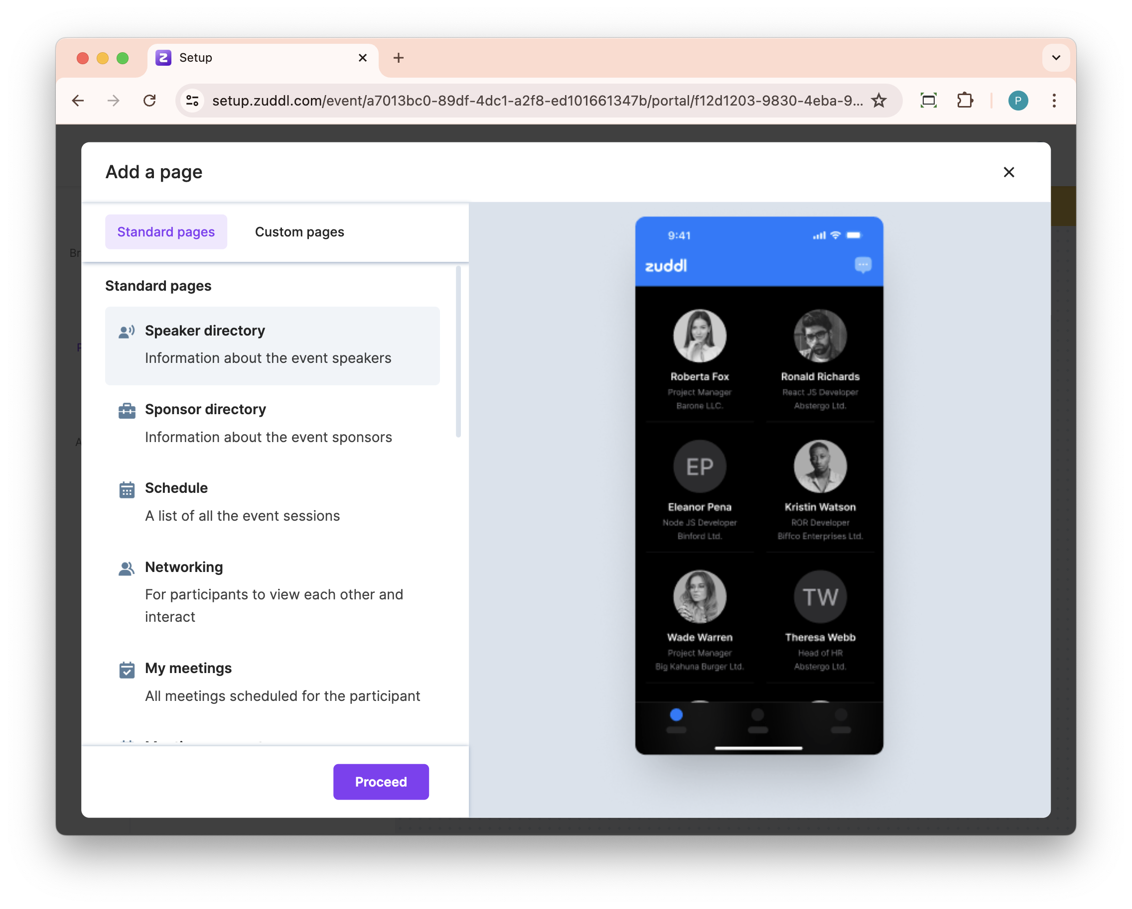 Under the Standard pages tab, click on the Speaker directory page and click on the Proceed button. This adds the speaker directory page to the menu.