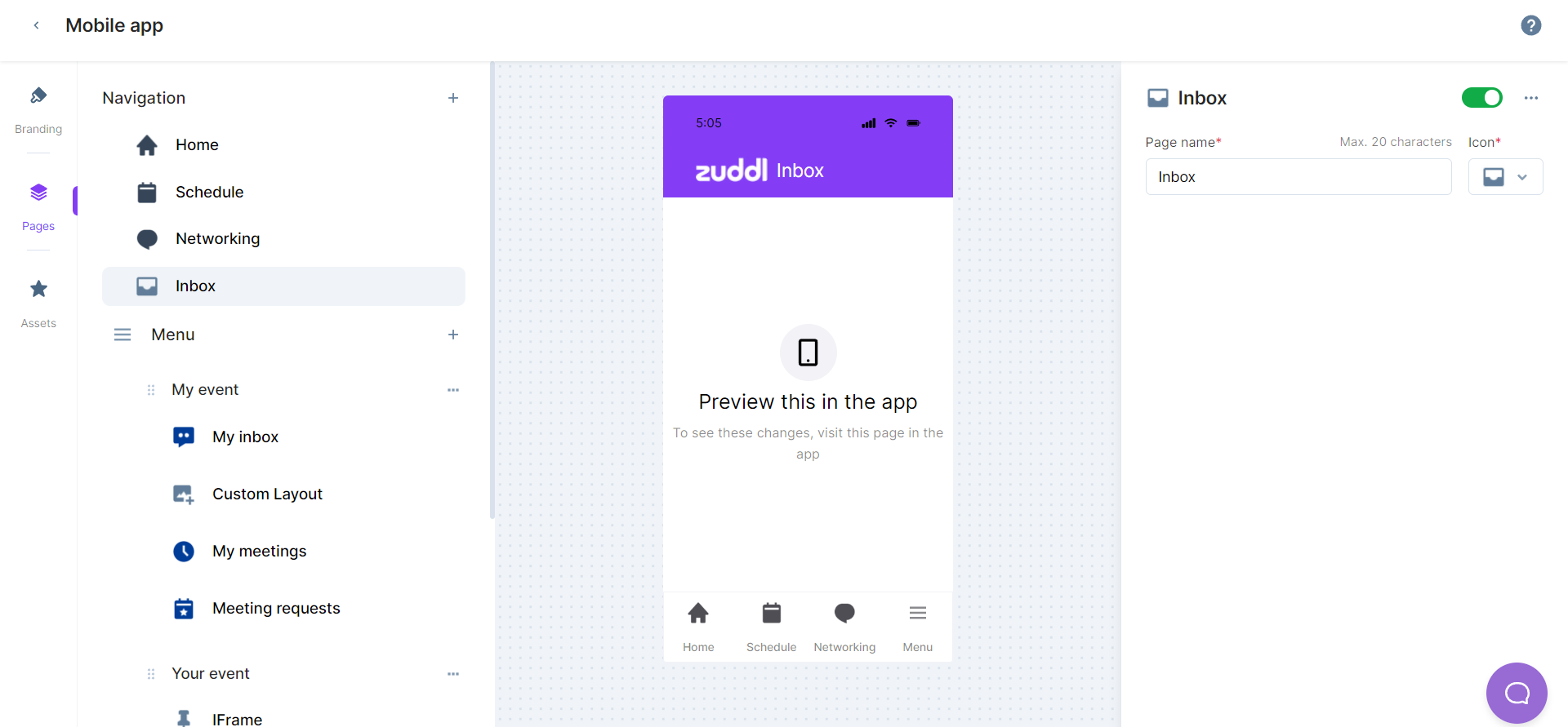 The Inbox page is a place where attendees can view the received messages. An Inbox page can be added in the Navigation or Menu sections. To add an inbox page,