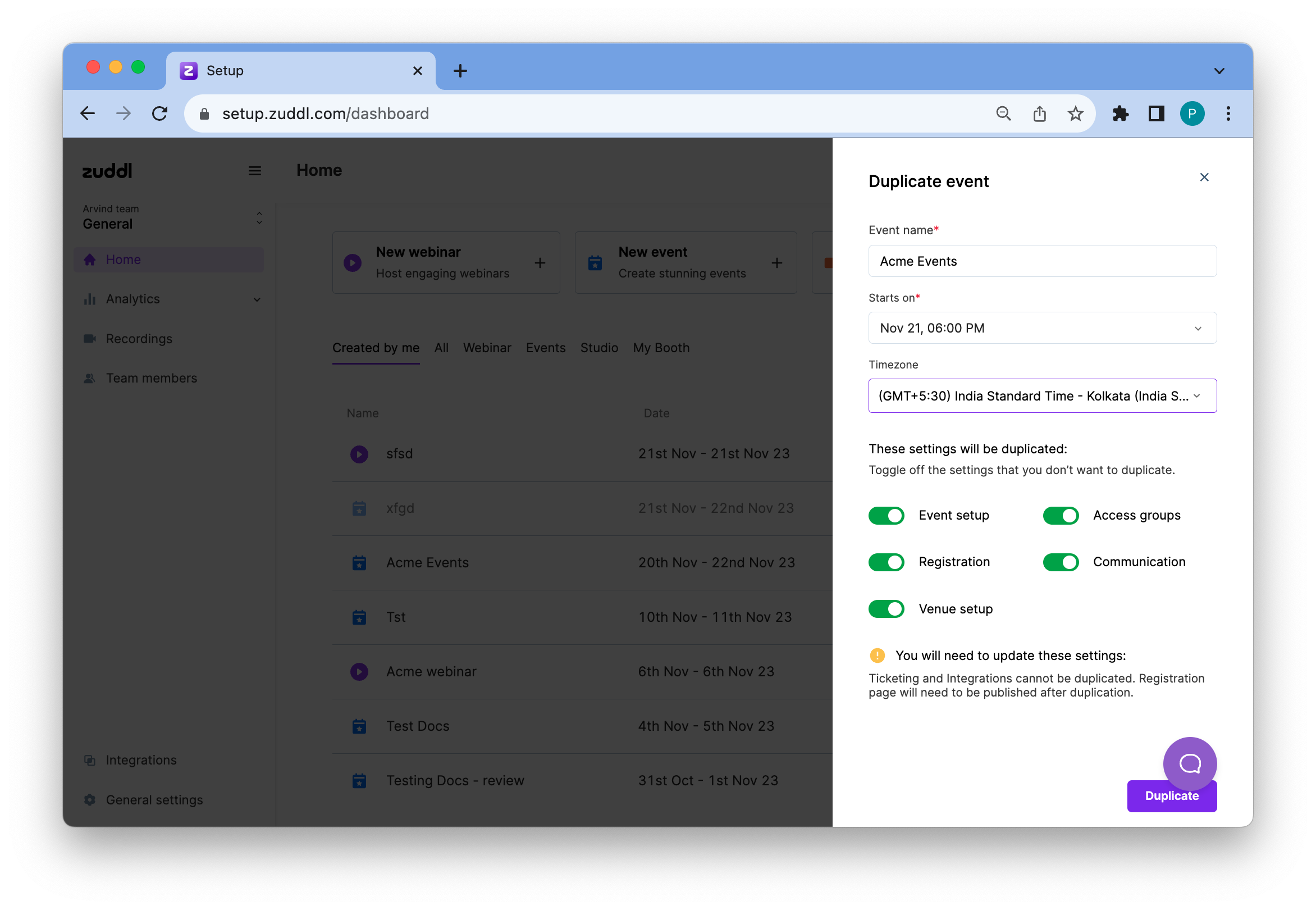 Events on Zuddl can be duplicated — you can have a nearly identical replica to use as a new event.