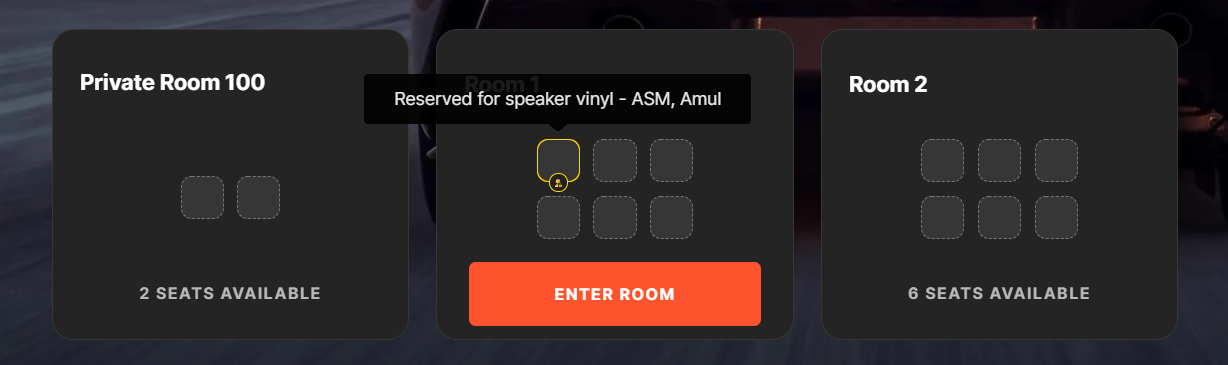 While creating a room, you can choose to reserve seats for selected participants in a room. Seats that are reserved appear highlighted. The name of the participants for whom the seat is reserved is displayed when hovered over the seat.