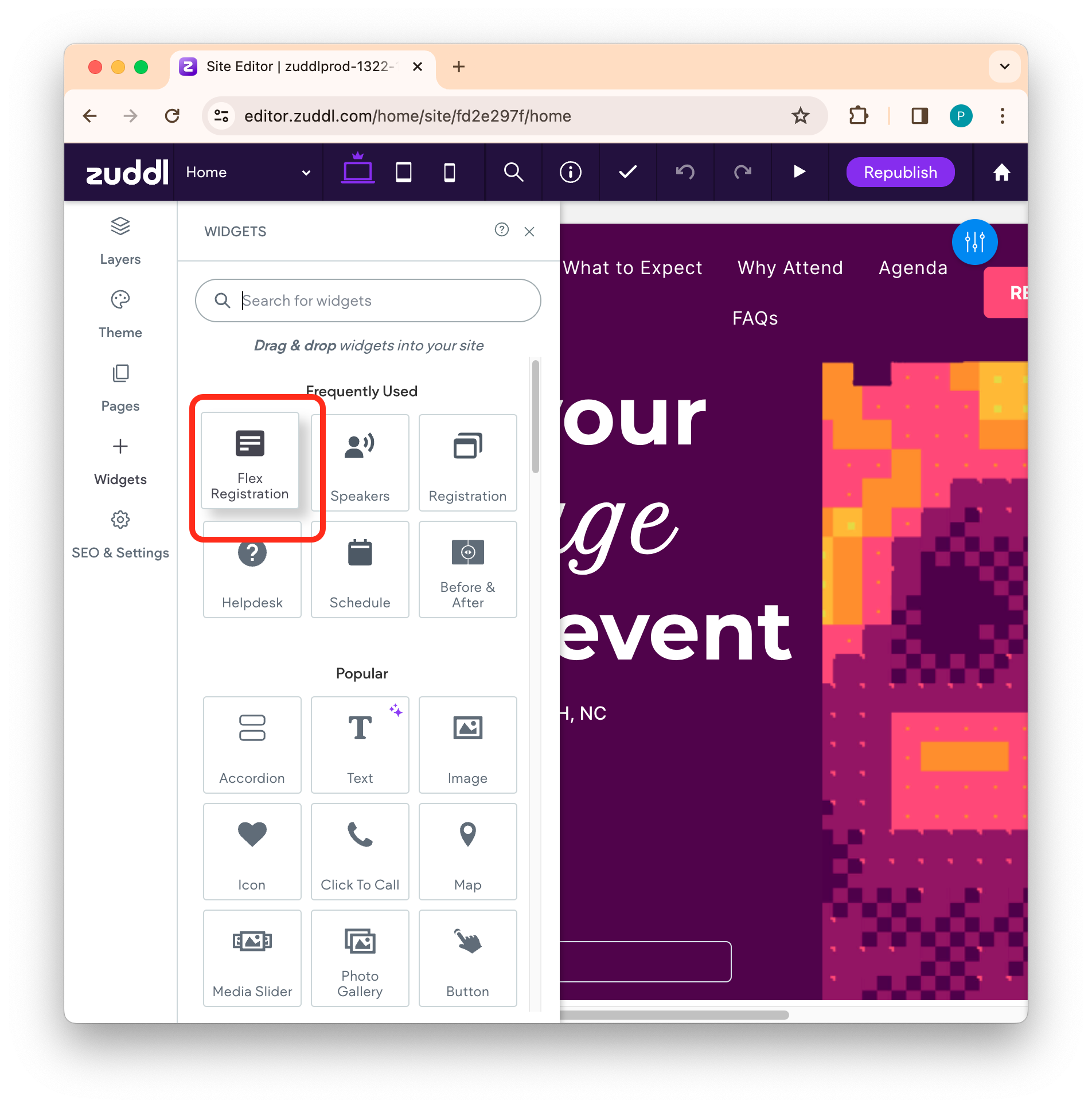 Widgets are your best friend when asking users to take action, especially on an event landing page. You can drag and drop a widget into the grids. To edit a widget, click a widget to open the edit option. You can:
