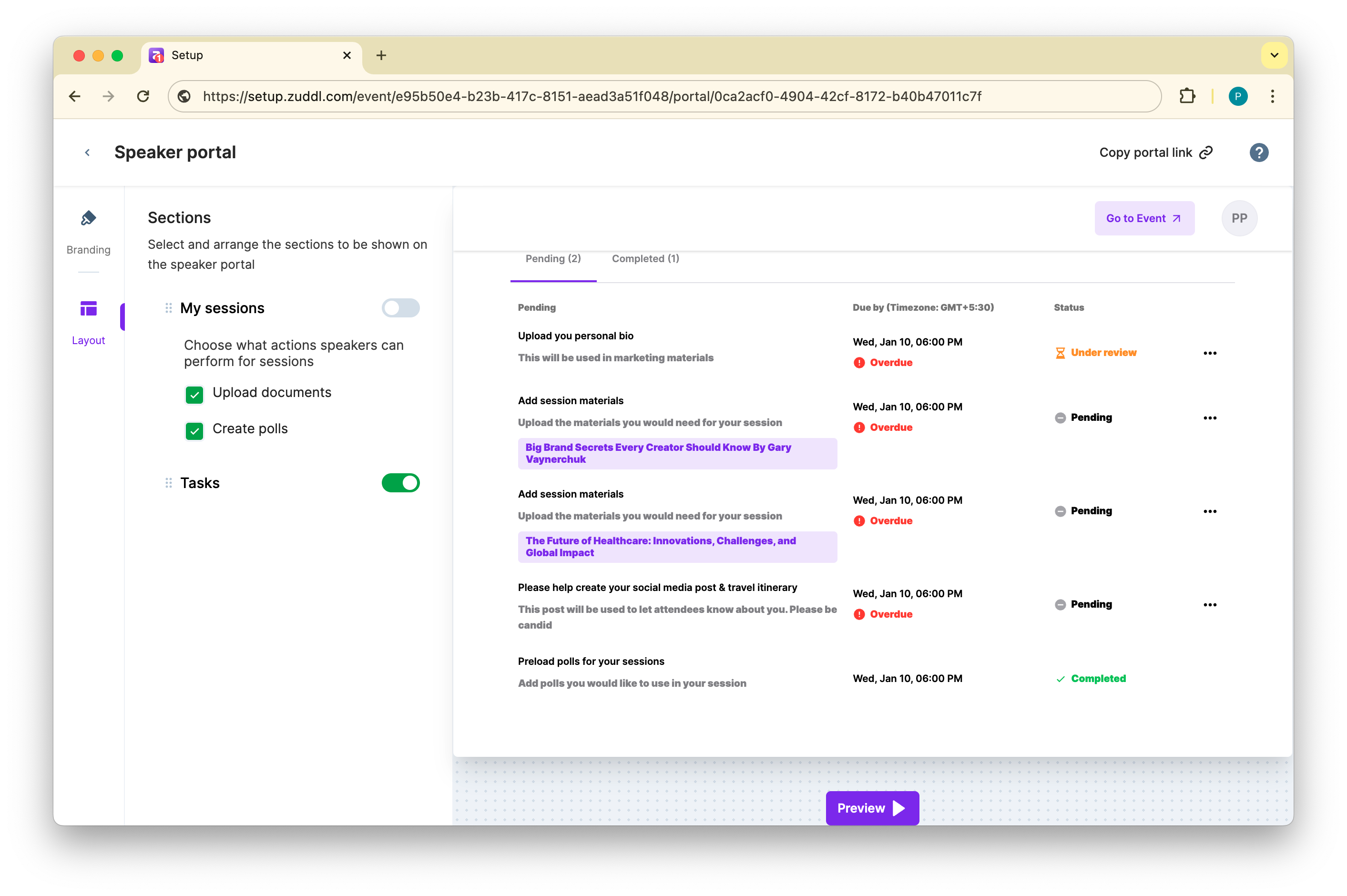 The speaker portal is where your speakers view their assigned tasks and update the task status.