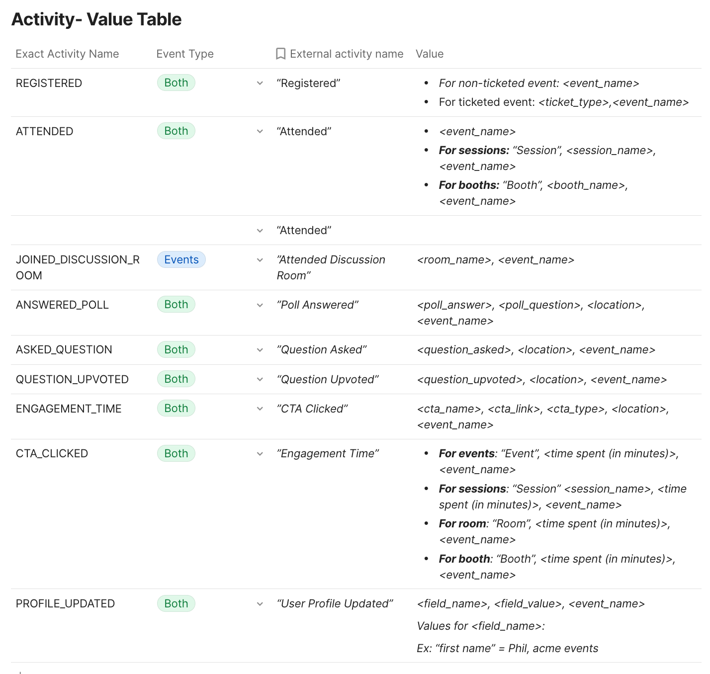 As seen in the screenshot above, the Activity_type for Zuddl is always “Zuddl Event Activities”. The detailed list of external activity names and their respective values are shown in the Activity-Value table shown in the above section. An example activity entry is as follows: