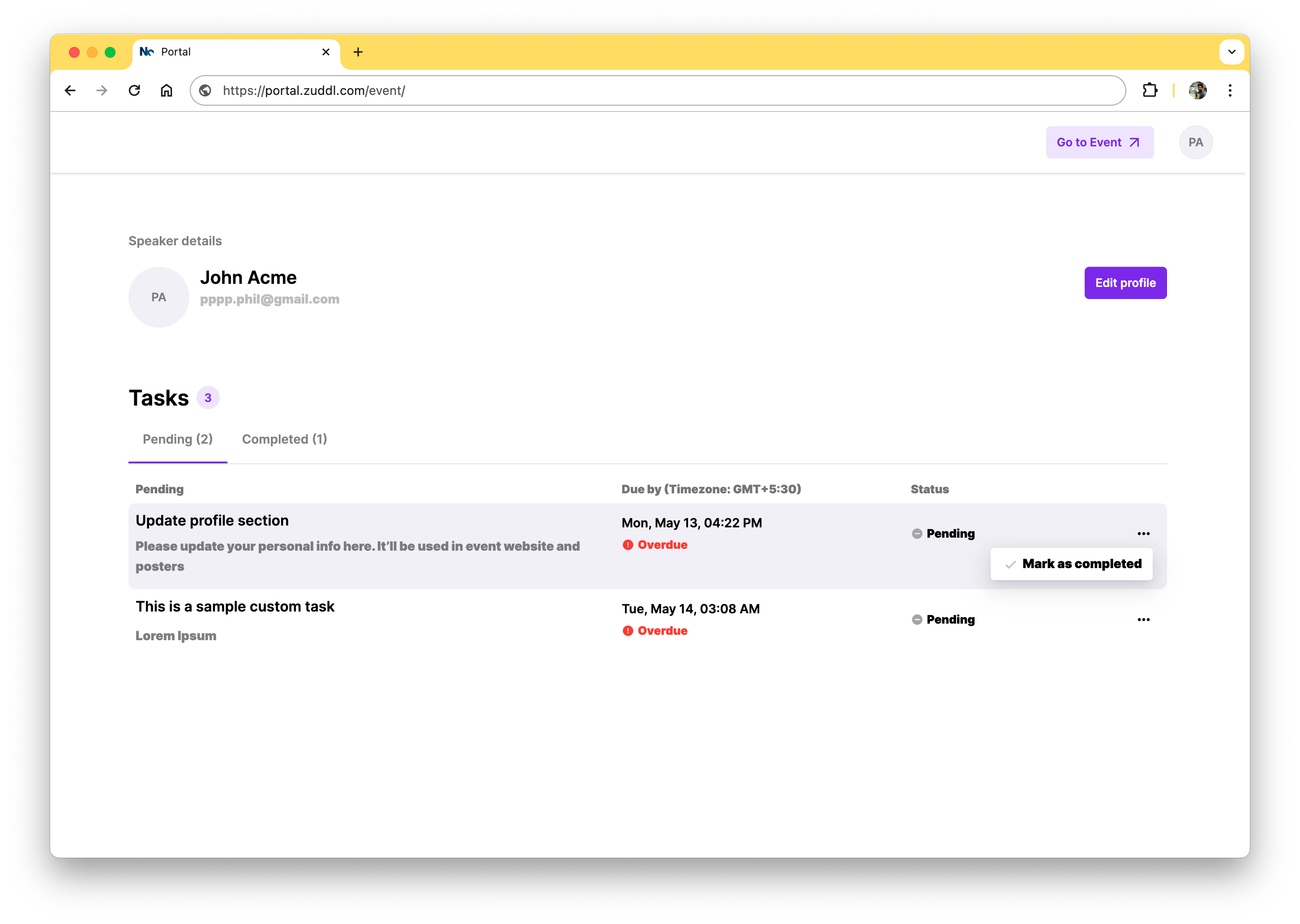- To mark a task as completed, a speaker can click the more options button and click Mark as completed. The completed tasks will appear in the Completed tab.