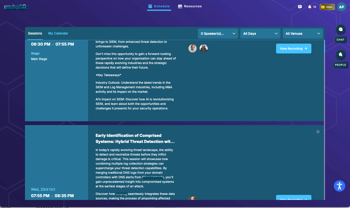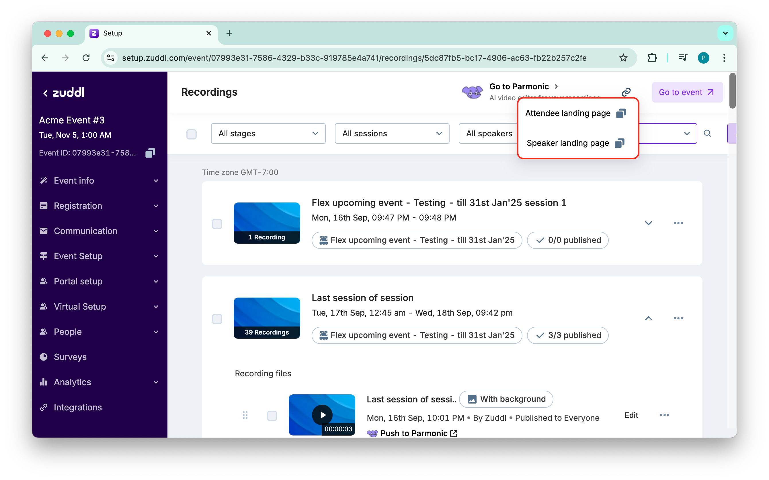 The recordings are now shown on the event landing page. Go to Registration > Registration page and click the link button shown below to access the Attendee landing page and the Speaker landing page.