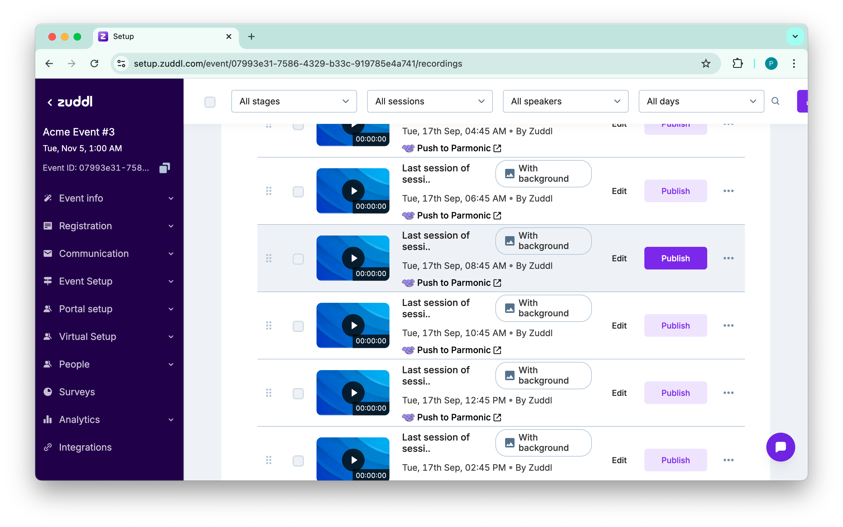 Event sessions are automatically recorded when you start and stop the session from Studio. All the recordings can be viewed on the account dashboard underĀ Recordings, and also inside the event setup on the Recordings page.