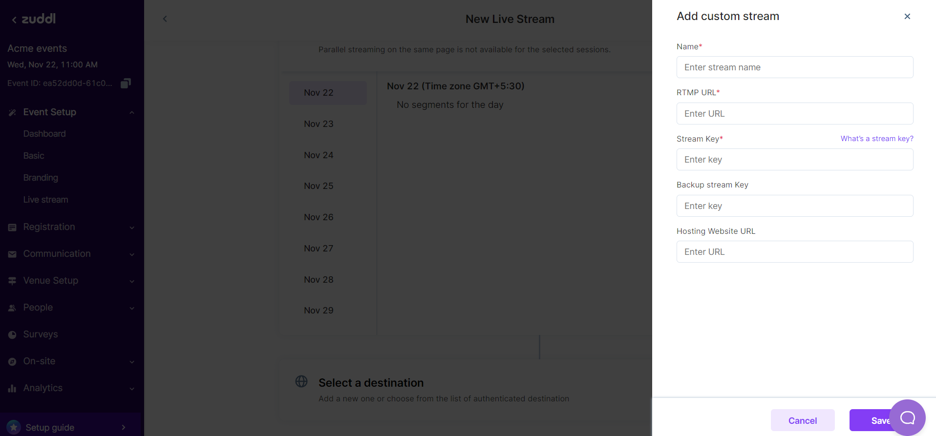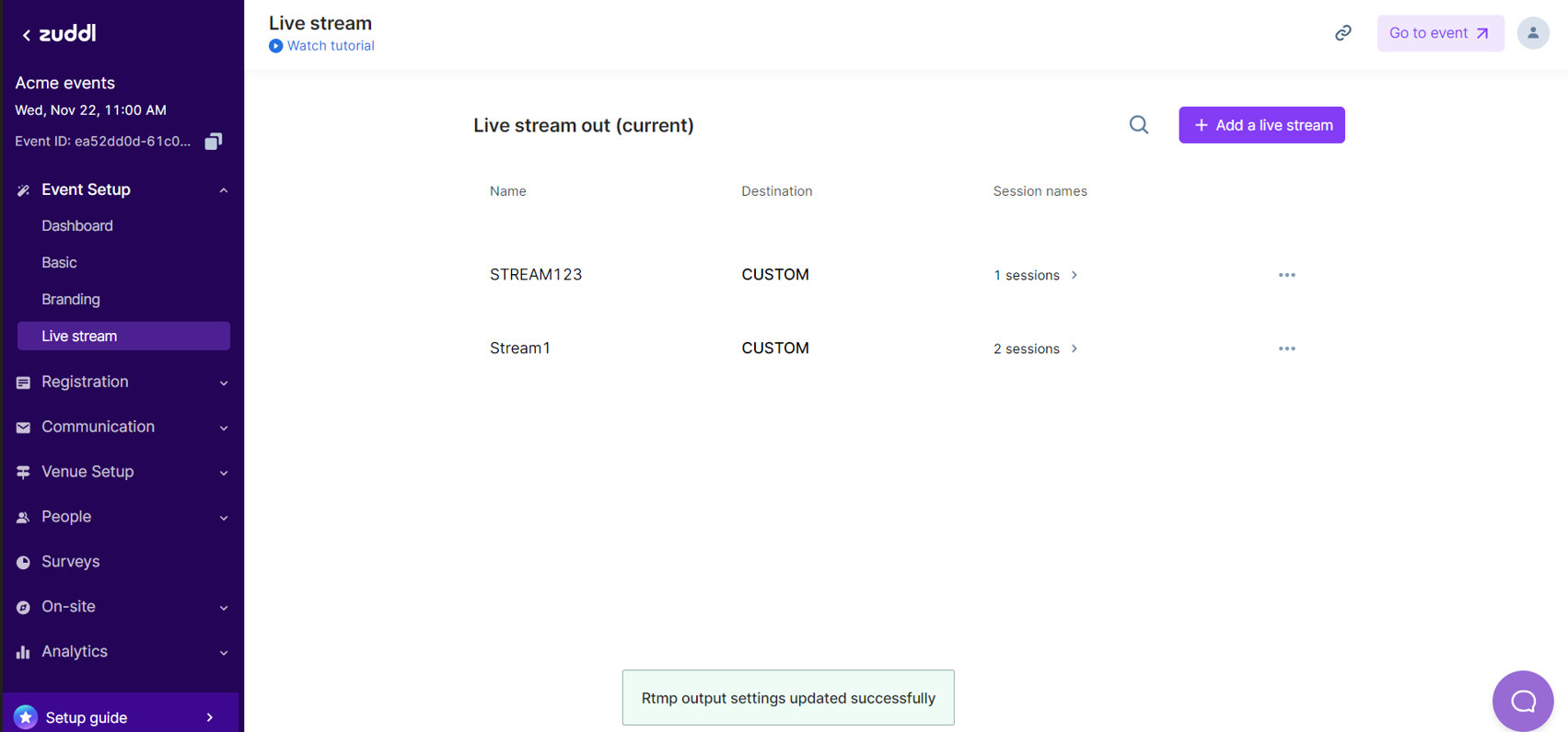 Go to Event Setup > Live Stream from the left navigation and click +Add live stream.